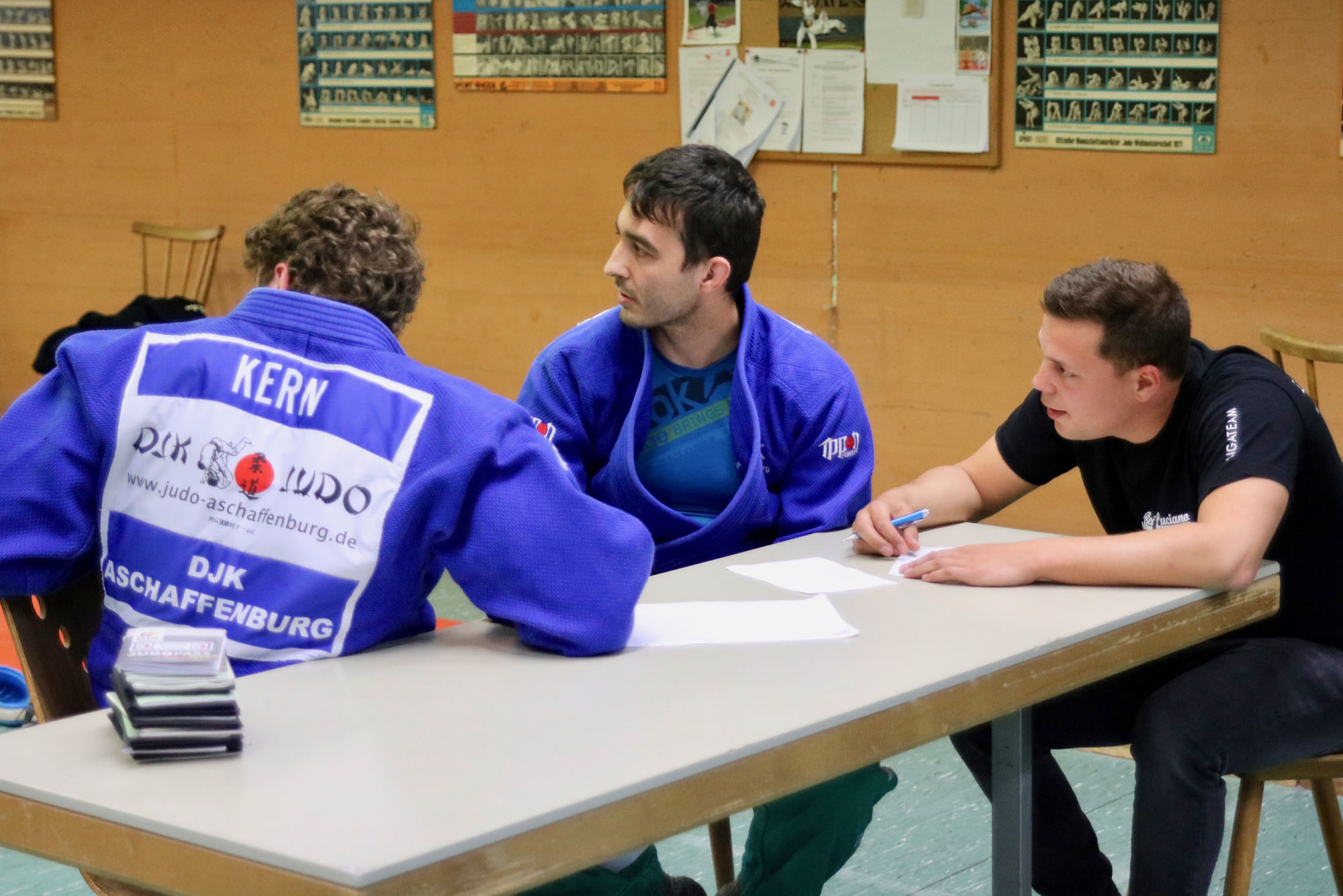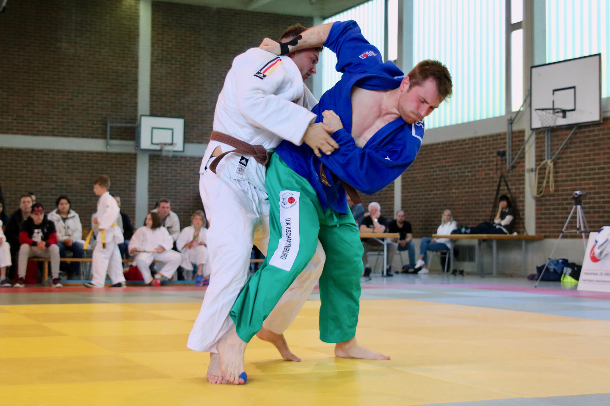 Dass es diesmal knapper werden würde als beim 15:5 Heimsieg vor vier Wochen war allen klar. Umso erfreulicher, dass David Flörchinger (-81 kg) seinen ersten Kampf gewinnen konnte. Auch Uli Brand (-81 kg) und Tom Junker (-73 kg) holten ihre Punkte, so dass die DJK einen guten Start erwischte. Nachdem der zweite Kampf -73 kg an die Gäste gegangen war, holte Marcus Kaiser (+90 kg) den vierten Punkt für die Gastgeber in gewohnter Manier: Er wartete überlegt ab, ließ den Gegner kommen und nutzte dann den perfekten Augenblick für seine Technik, diesmal ein Konter, der ihm den Ippon zum vorzeitigen Sieg brachte. Punkt Nummer 5 holte anschließend Patrick Dobai-Krecht (+90 kg) im Boden. Im Leichtgewicht (-66 kg) konnten die Gäste zwei Punkte aufholen. Lukas Ühlein lieferte dabei trotz seiner „nur“ 55 kg seinem fast 10 kg schwereren Gegner einen derart guten Kampf, dass er sogar Chancen gehabt hätte, zu gewinnen, wäre er nicht durch eine unglückliche Kampfrichterentscheidung mit einem zweiten Waza-ari in Rückstand geraten. In der letzten Gewichtsklasse des ersten Durchgangs konnte nur Niklas Kern punkten, das jedoch mit gewohnter Souveränität, so dass die DJK Aschaffenburg mit einer knappen, aber vielversprechenden 6:4 Führung in die Pause ging.