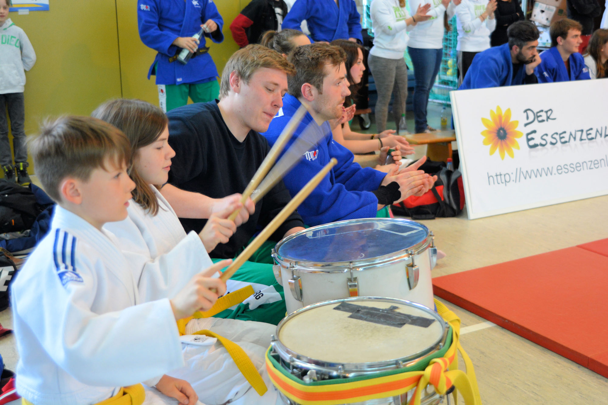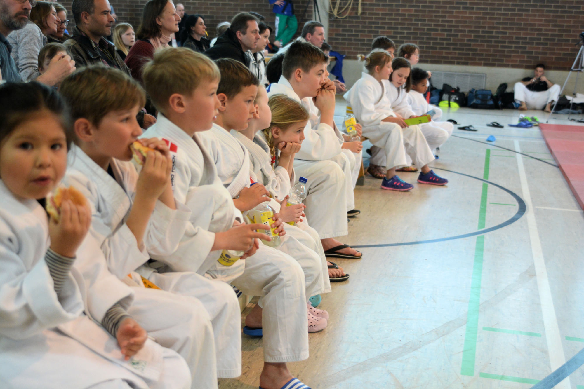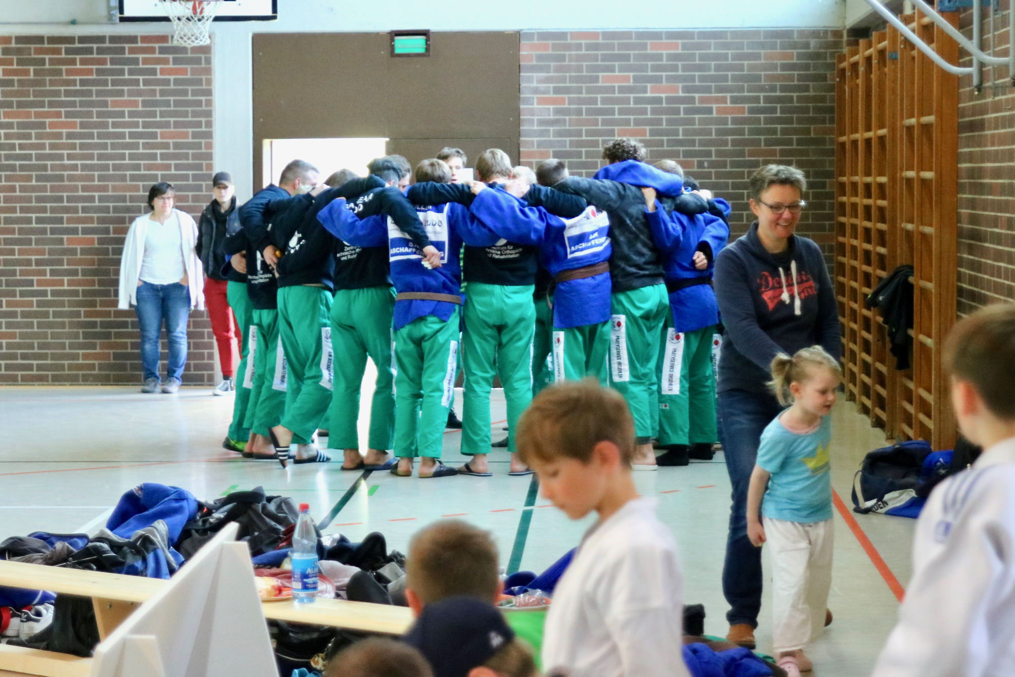 Die Halle war wieder gut gefüllt, nicht zuletzt durch die Kinder und Eltern aus mehreren Vereinen vom Untermain, die für ein U12 Randoritraining vor dem Beginn der Landesligabegegnung gekommen waren. Unter der Leitung von Anja Ühlein haben die Kids ihren Eltern und den anwesenden Zuschauern gezeigt, was sie auf der Matte schon alles können. Um 16.00 Uhr ging es dann mit dem Einzug der Athleten los – wieder begleitet von den Judokids.