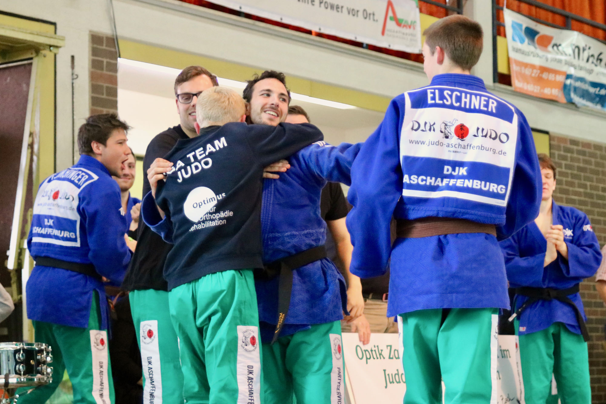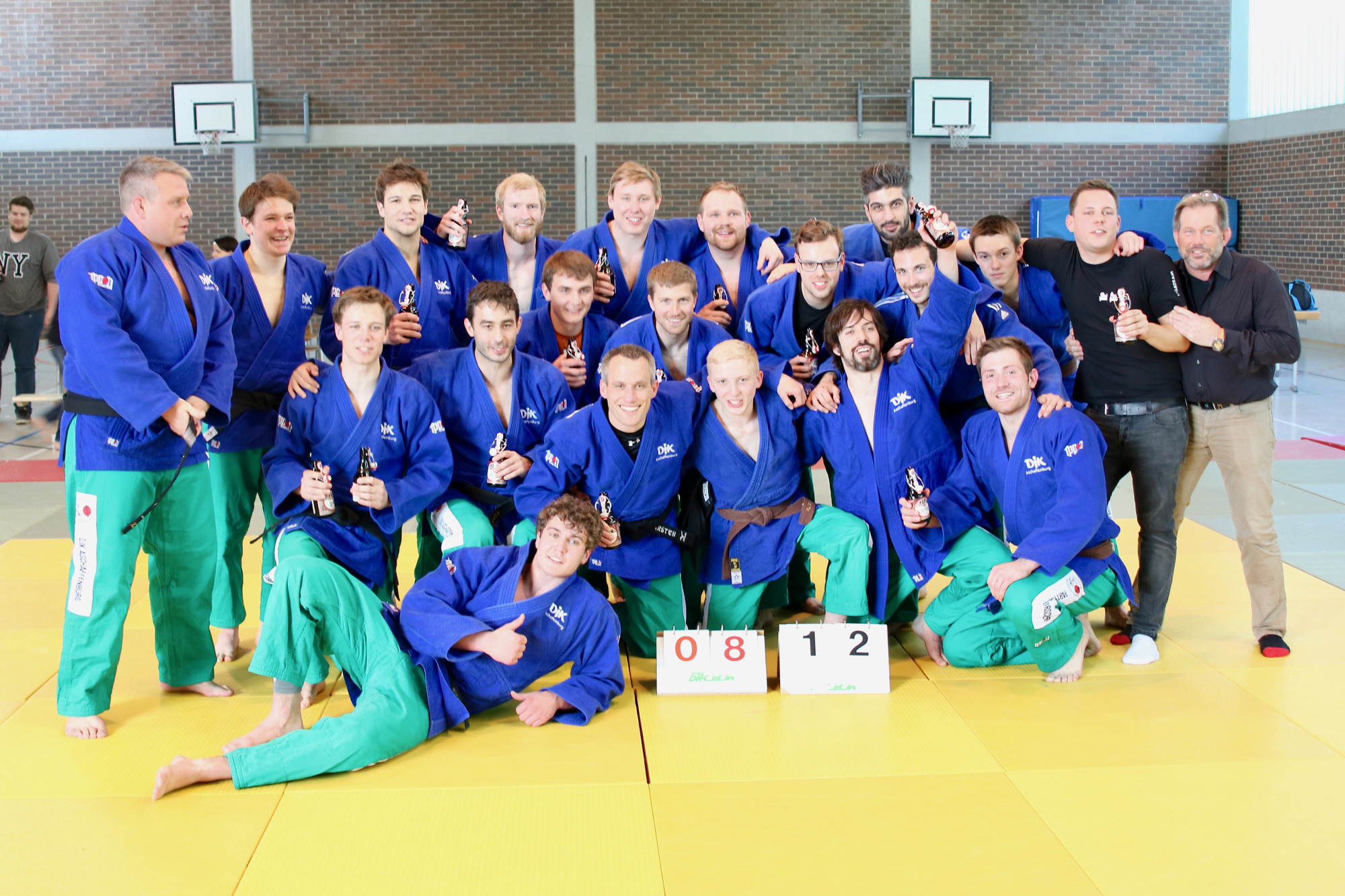 Mit nur wenigen Umbesetzungen ging es dann in die Rückrunde. Die DJK musste „nur“ noch fünf Punkte holen, um den Sieg perfekt zu machen. Einer davon, das war klar nachdem die Aufstellung der Gegner bekannt wurde, würde kampflos sein, weil sich die Gäste aus taktischen Gründen entschieden hatten, für die zweite Runde einen Platz in der Gewichtsklasse +90 kg unbesetzt zu lassen. Der erste Punkt -81 kg ging direkt an die KG Ansbach-Altenfurt. Zwischenstand: 6:5. Uli Brand (-81 kg), Tom Junker und Jonas Ludwig (beide -73 kg) holten dann jedoch ihre Punkte nach Aschaffenburg. Der nächste Zähler ging in der Gewichtsklasse +90 kg wie erwartet kampflos an die DJK. Beim neuen Stand von 10:5 lag der Sieg in greifbarer Nähe, es fehlte nur noch ein einziger Punkt. Im zweiten Kampf +90 kg sorgten die Gäste mit einem Sieg dafür, dass die Lokalmatadoren noch ein wenig warten mussten, bevor Fabio Pecchia (-66 kg) den Sack zumachte und den entscheidenden elften Punkt holte. Auch wenn zu diesem Zeitpunkt der Gewinner bereits feststand, gaben Jonas Elschner (-66 kg), Marco Senfleben und Niklas Kern (beide -91 kg) alles. Marco konnte seinen Kampf für sich entscheiden, die beiden anderen Punkte gingen noch an die Gäste. An der ausgelassenen Stimmung über den 12:8 Heimsieg und der anschließenden Siegesfeier, zuerst bei Sponsor Luciano in der DJK Vereinsgaststätte und anschließend in der Stadt, konnte das jedoch nichts ändern.