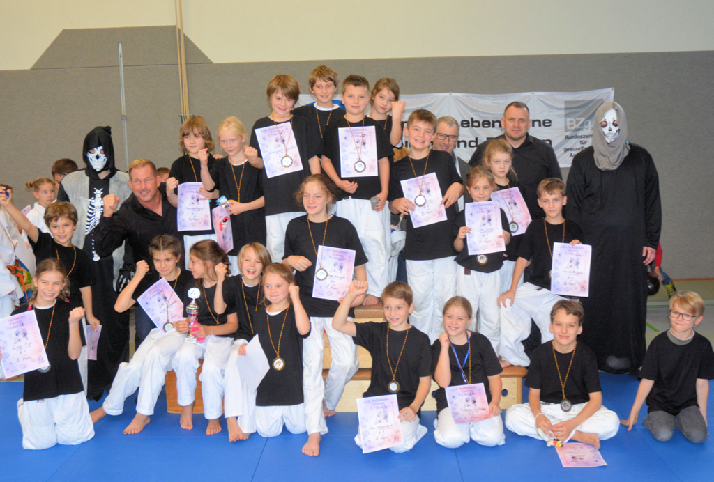 Das Trainerteam Dirk Lichhardt, Jonas Ludwig, Niklas Kern und Detlef Staffa hatte an den zwei Matten und seinen 20 Nachwuchsathleten alle Hände voll zu tun. Sie führten die jungen DJK-Judoka zu 6 Gold-, 5 Silber- und 9 Bronzemedaillen. Bei der Siegerehrung verteilten zwei passend zu Halloween Verkleidete Süßes und ließen schnell den Schweiß des Tages vergessen.