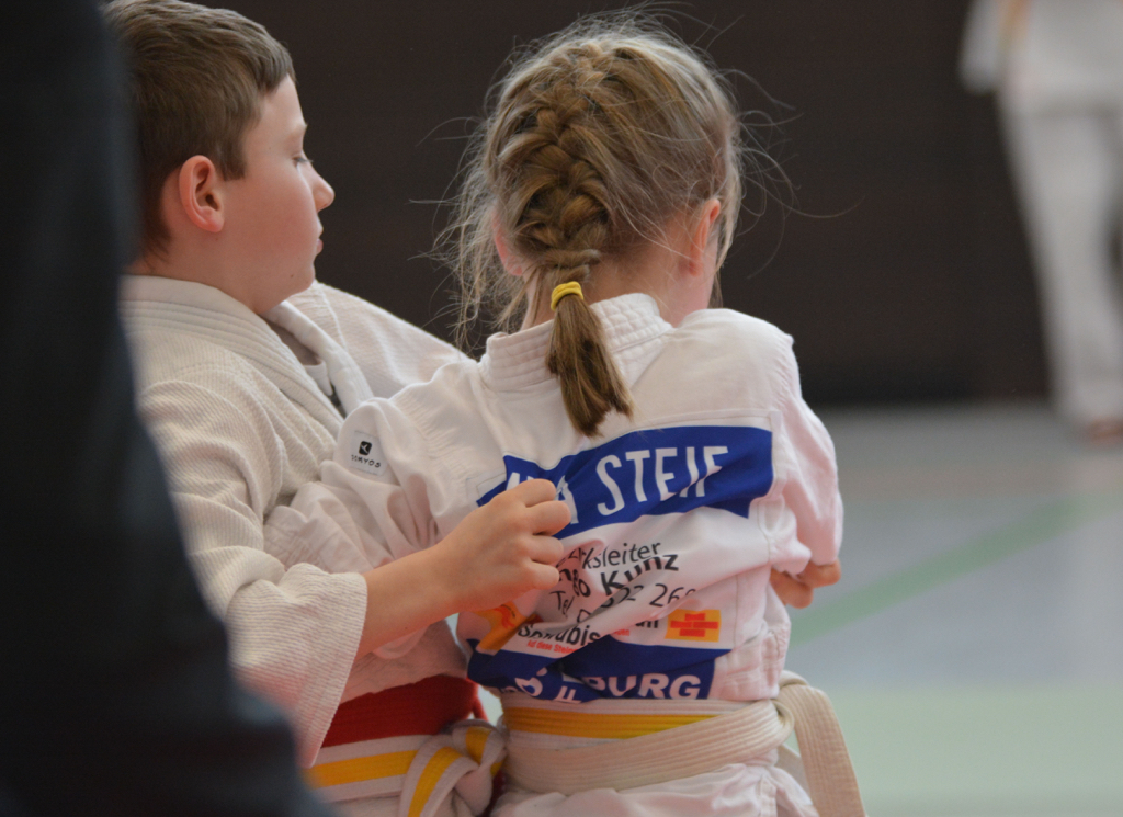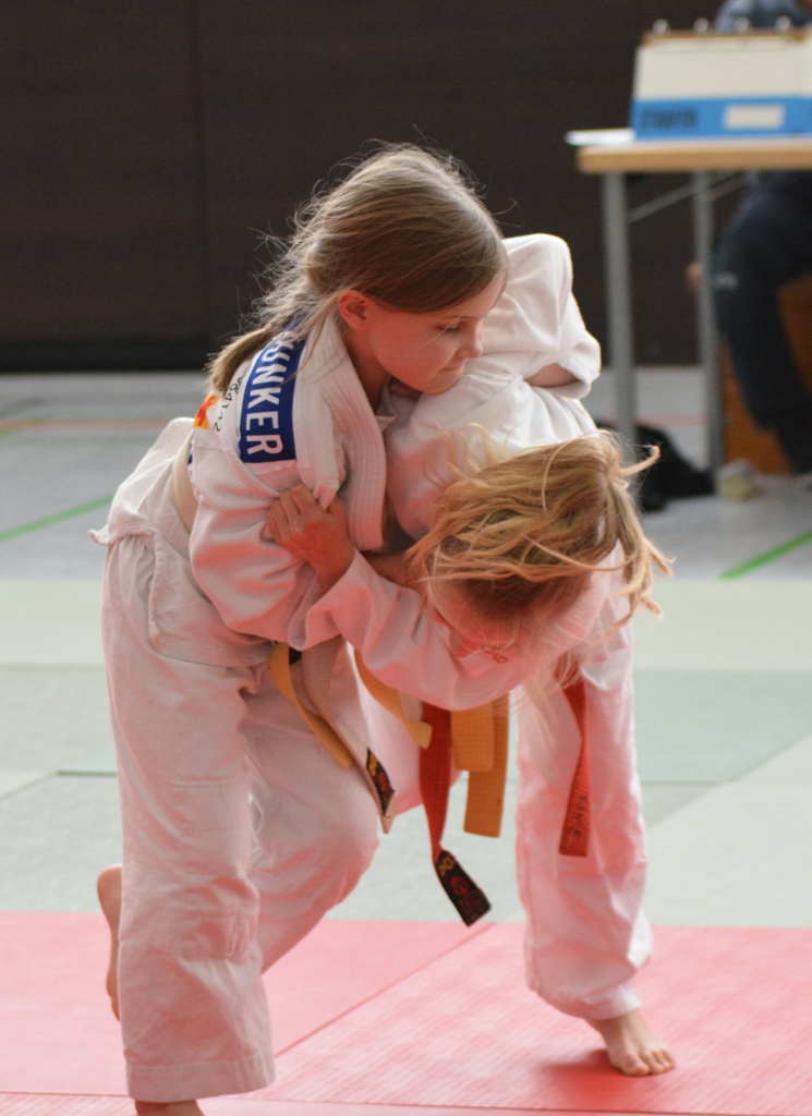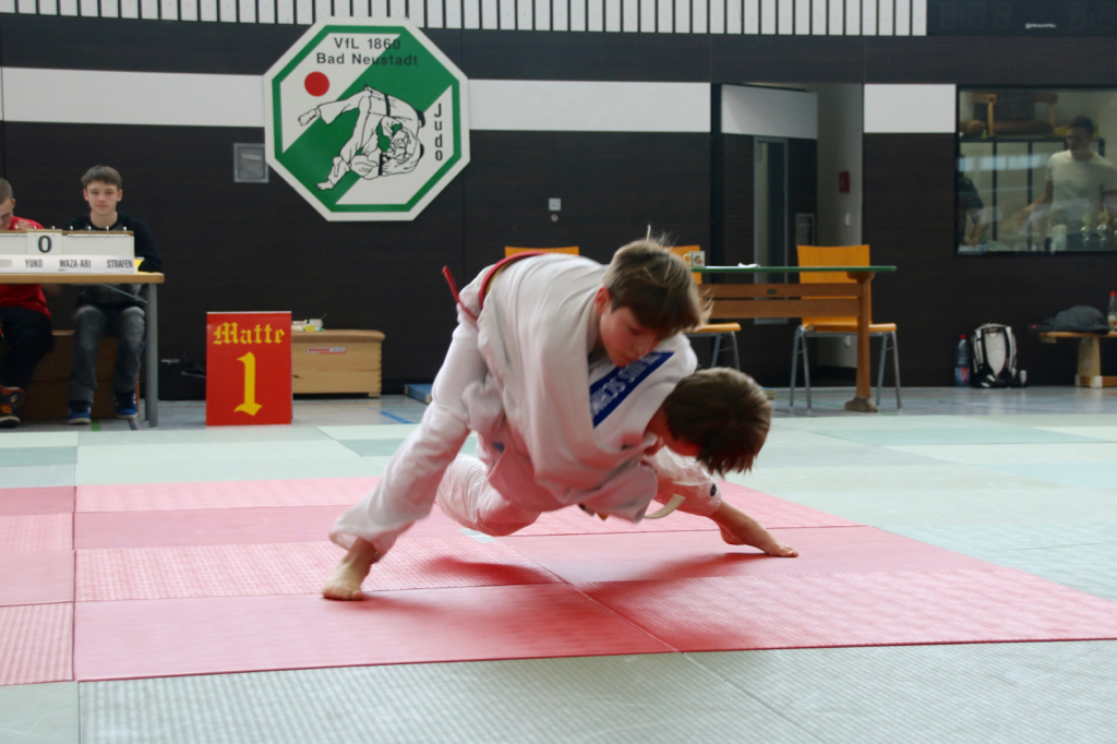 Die Teilnehmer in der U10 waren zu diesem Zeitpunkt bereits schon mit Niklas Kern als Coach auf der Matte. Erstmalig kämpften in der jüngsten Altersklasse Jungs gegen Mädchen, so wie im Training. Valentin Gotic, der morgens erst noch zur Teilnahme überredet werden musste, schaltete in der Halle auf Wettkampfmodus um und gewann alle seine Begegnungen und damit den Unterfränkischen Meistertitel. Glückwunsch! Emma Steif und Layla Sommer mussten sich jeweils einem Jungen geschlagen geben, gewannen aber dennoch Silbermedaillen. Finnegan Koch holte bei seinem ersten Turnier die Bronzemdaille.