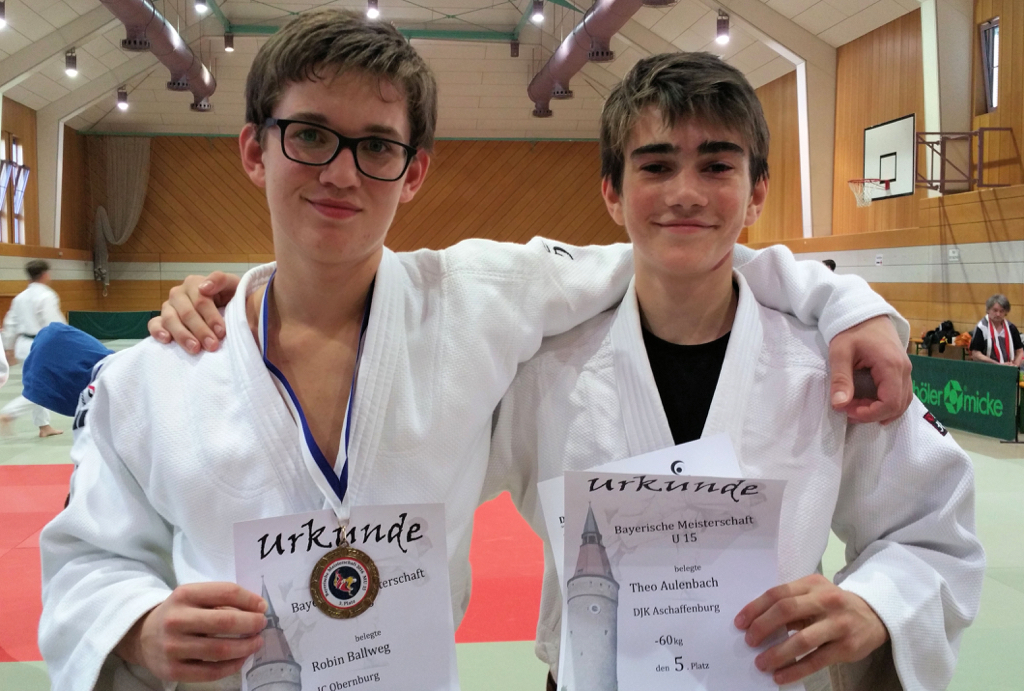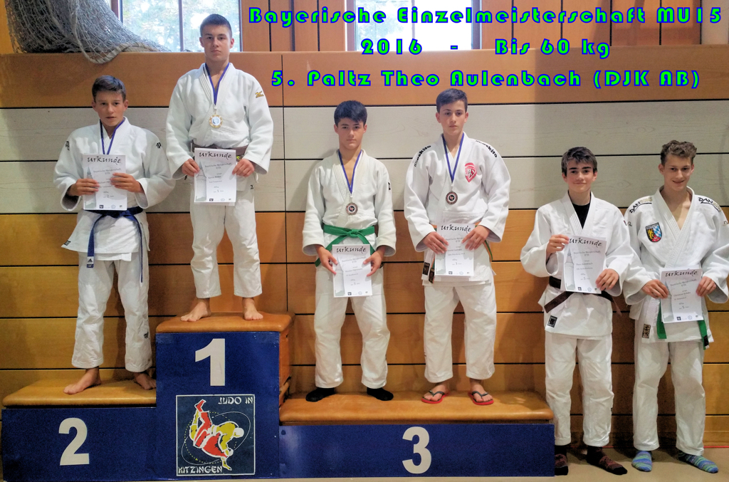 Am Samstag fand die Bayerische Meisterschaft der Schüler U15 in Kitzingen statt. Theo Aulenbach von der DJK Aschaffenburg musste in die Gewichtsklasse -60 kg hochrutschen, da in seiner eigenen Klasse (-55 kg) kein Platz mehr frei war und er während der Qualifikation auf einem Sichtungsturnier in Halle war. Eine Auftaktniederlage gegen den Kaufbeurer Hartmann schickte ihn in die Trostrunde. Drei Siege dort brachen ihn jedoch in das kleine Finale um Platz drei. Dort ging es wieder gegen den Kaufbeurer Hartmann. Leider ging auch diesmal das Konzept nicht auf und Theo musste sich mit dem fünften Platz zufrieden geben, der jedoch trotzdem die Qualifikation für die Süddeutsche Meisterschaft bedeutete.