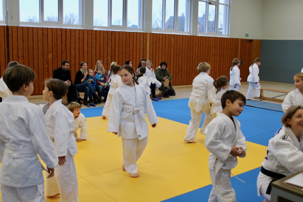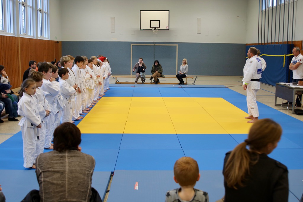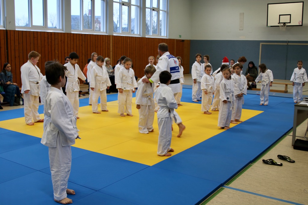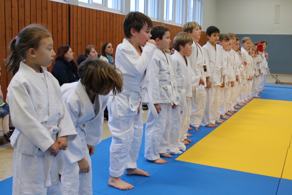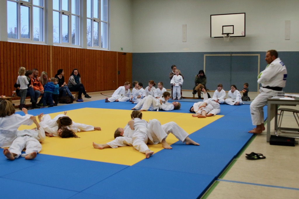 Am 13. Dezember stellten sich die Kids der Dienstagsgruppe in der Grünewaldschule ihrer ersten Gürtelprüfung im Judo. Nach mehr als sechsmonatiger intensiver Vorbereitung zeigten die 28 jungen Judoka, was sie bei ihren Trainern, Andrea Schlauersbach und Carsten Sann, gelernt haben. Unter den Augen des Prüferteams Detlef Staffa und Klaus Richter demonstrierten die Kinder die Fallschule rückwärts, seitwärts und die Judorolle. Anschließend ging es dann jeweils mit Partner in den Technikteil, in dem zwei Verkettungen von Wurf, Haltegriff und nachfolgende Befreiung aus dem Haltegriff gezeigt werden mussten. Den letzten Teil der Prüfung bildeten mehrere Bodenrandoris (Übungskämpfe) mit wechselnden Partnern.