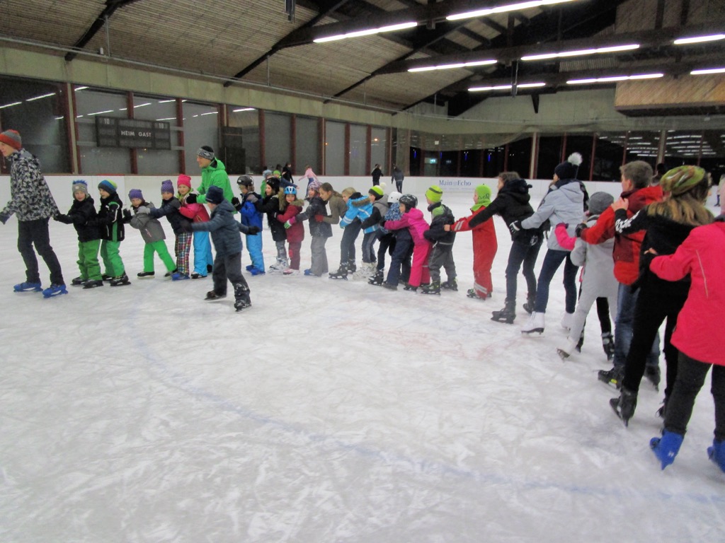 Am vergangenen Donnerstag trafen sich deshalb über 70 Kinder und Jugendliche zwischen 6 und 16 Jahren aus verschiedenen Abteilungen der DJK zum Schlittschuhlaufen in der Aschaffenburger Eissporthalle am Schulzentrum. Aufgrund der unterschiedlichen Trainingsräume und -zeiten kennen sich die Jugendlichen nicht unbedingt alle untereinander. Nach kurzer Zeit auf dem Eis jedoch waren die ersten neuen Kontakte geknüpft, und man half sich wie selbstverständlich gegenseitig bei Unsicherheiten.