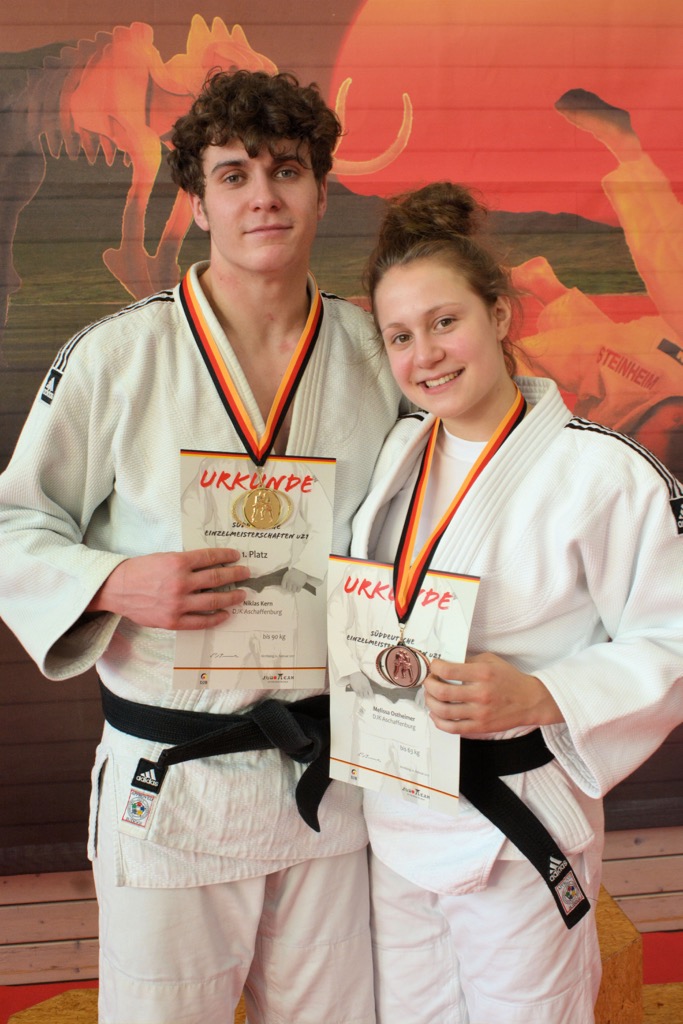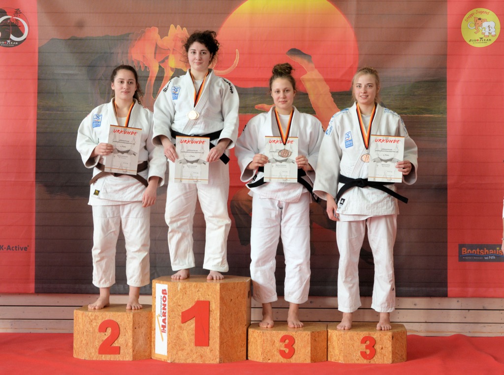 Melissa Ostheimer, die letzte Woche noch ihre Abiturprüfungen im Judointernat Kaiserslautern ablegte, wurde von der Landestrainerin auf die Süddeutsche Meisterschaft gesetzt. Hier zeige sie ihre Klasse und konnte im ersten Kampf Jule Horn aus Karlsruhe mit zwei Waza-ari besiegen. Gegen die nächste Gegnerin, Christina Daiger (Bad Krotzingen), ging sie bereits nach 30 Sekunden mit einem Schulterwurf vorzeitig als Gewinnerin von der Matte. Im Halbfinale gegen die spätere Siegerin Sarah Grünewald, konnte Melissa Ostheimer im Stand gut mithalten, musste sich aber im Boden einem Armhebel geschlagen geben. Im kleinen Finale um Platz 3 nutzte die Aschaffenburgern dann einen Übergang vom Stand in den Boden zu einer Würgetechnik, und besiege die Esslingerin Maria Pfeiffer. Zur Belohnung stand sie auf dem Treppchen und durfte die Bronzemedaille in der Gewichtsklasse -63 kg mit nach Hause nehmen.