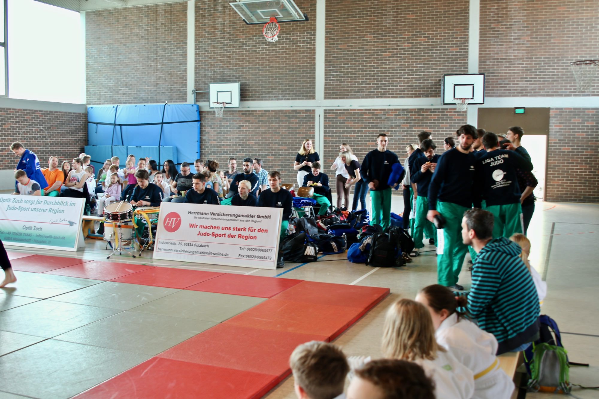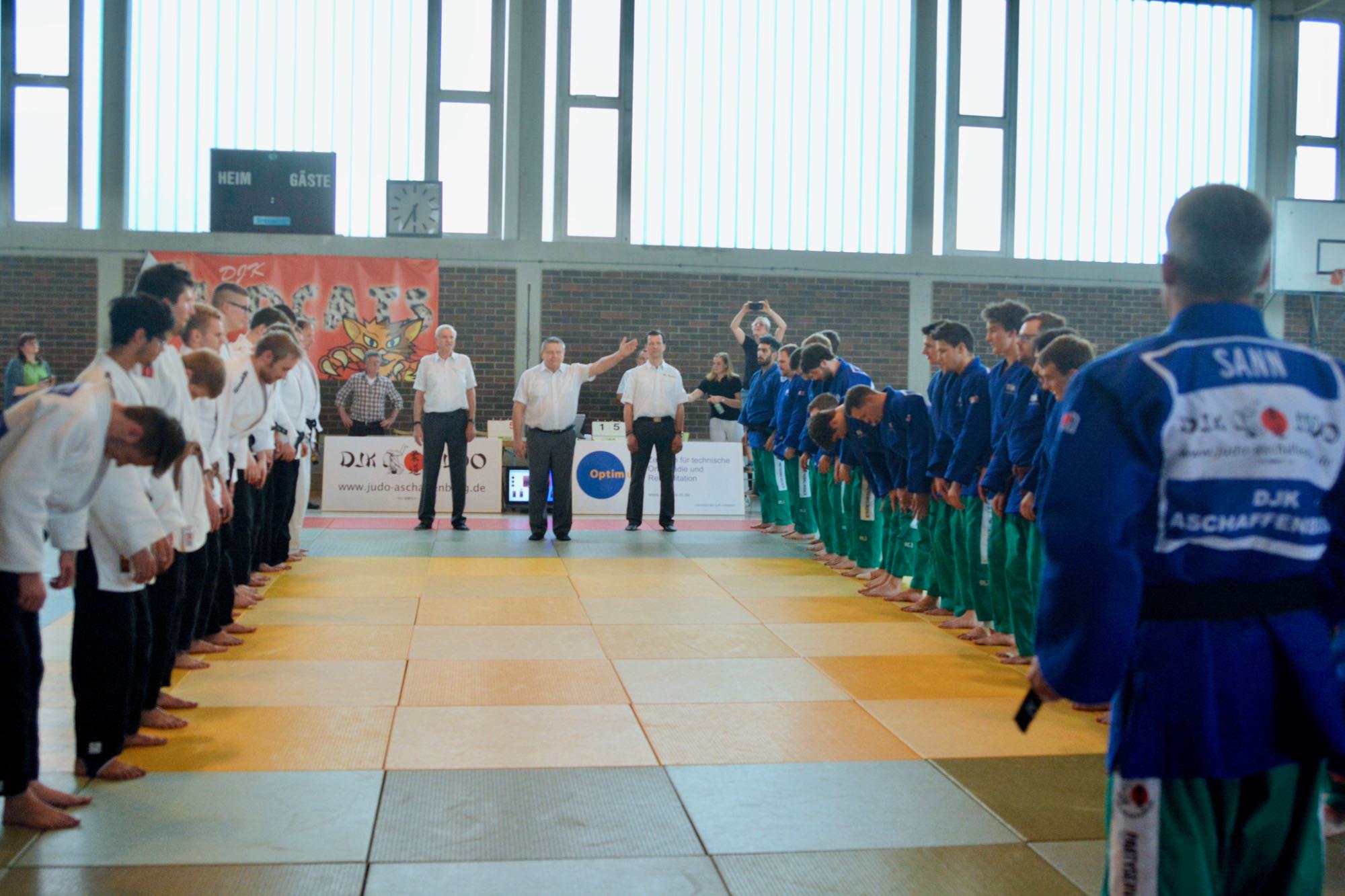 Zum zweiten Kampftag der Landesliga Nord der Männer reisten am Samstag die Judoka der Kampfgemeinschaft Bamberg-Münchberg nach Aschaffenburg, für die DJK war es gleichzeitig der erste Heimkampf der Saison. Entsprechend groß war die Vorfreude und zusammen mit gut 150 Zuschauern fieberten die Lokalmatadore dem Kampfbeginn entgegen. Der Einzug der Athleten wurde vom Hallensprecher und Kindern aus den Anfängergruppen der DJK begleitet, die anschließend beim Angrüßen aufgeregt und stolz mit auf der Matte standen.