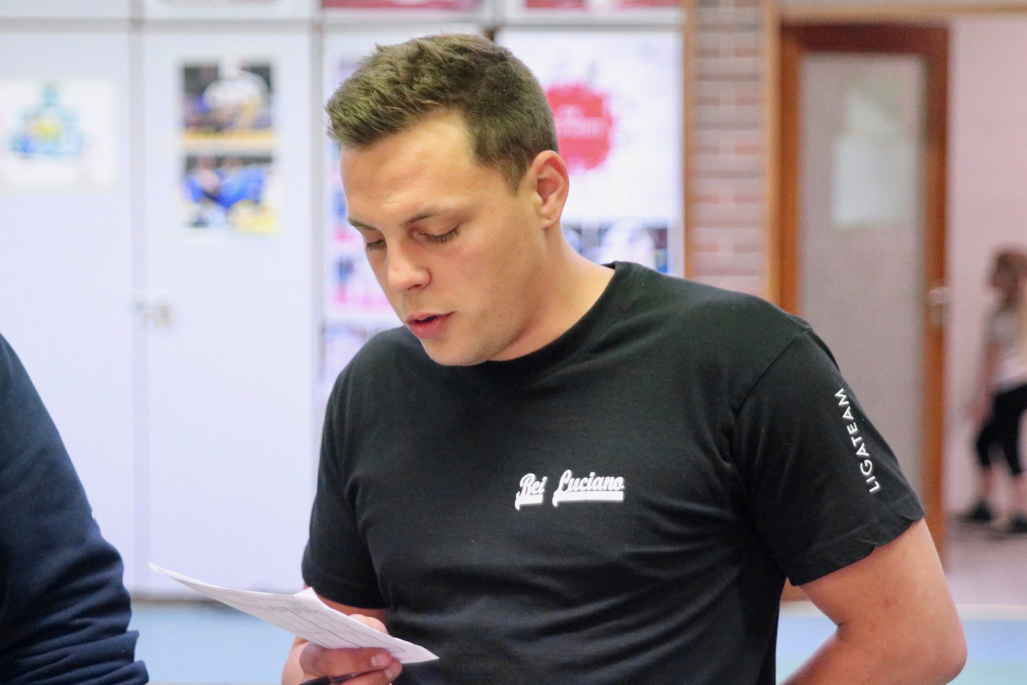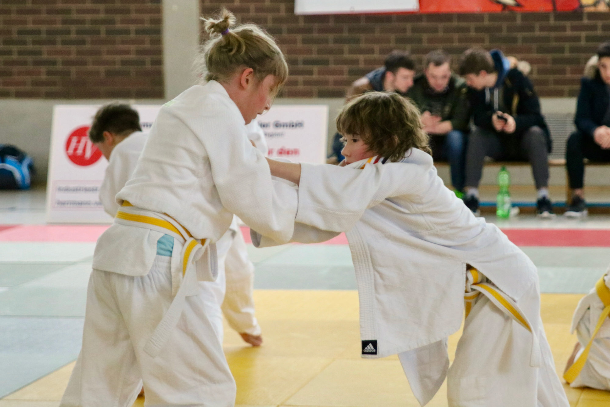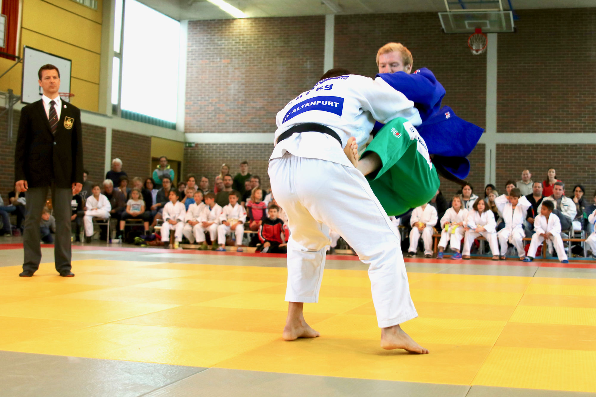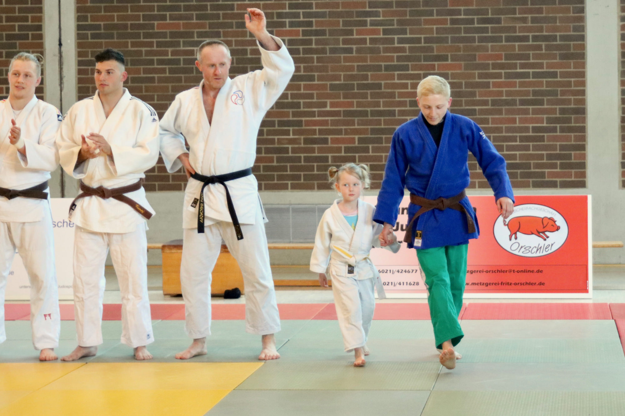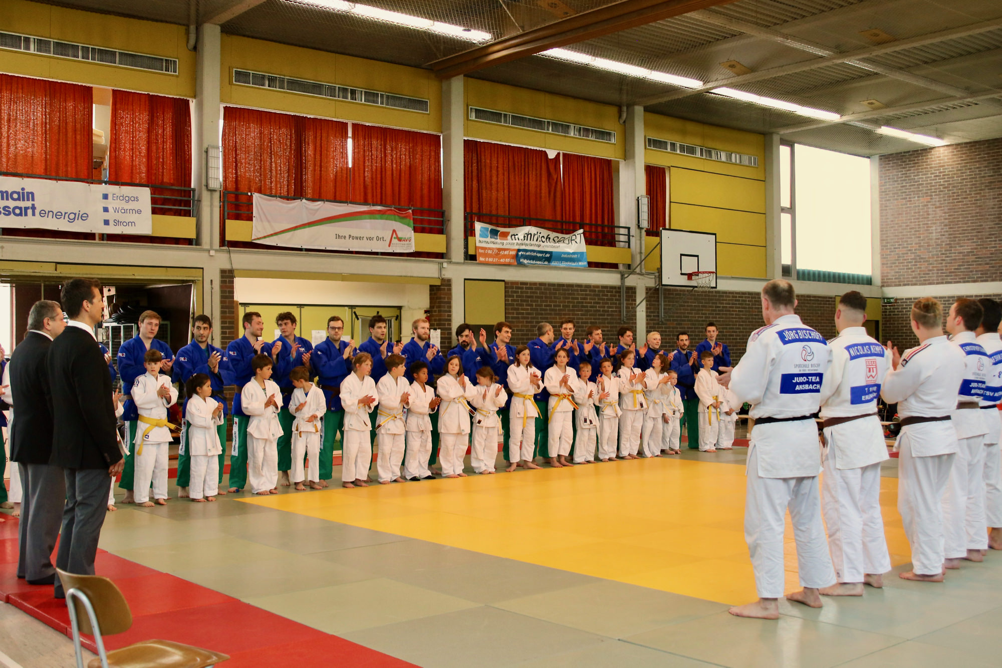 Die Halle war wieder gut gefüllt, nicht zuletzt durch die Kinder und Eltern aus mehreren Vereinen vom Untermain, die für ein U12 Randoritraining vor dem Beginn der Landesligabegegnung gekommen waren. Unter der Leitung von Anja Ühlein haben die Kids ihren Eltern und den anwesenden Zuschauern gezeigt, was sie auf der Matte schon alles können. Um 16.00 Uhr ging es dann mit dem Einzug der Athleten los – wieder begleitet von den Judokids.
