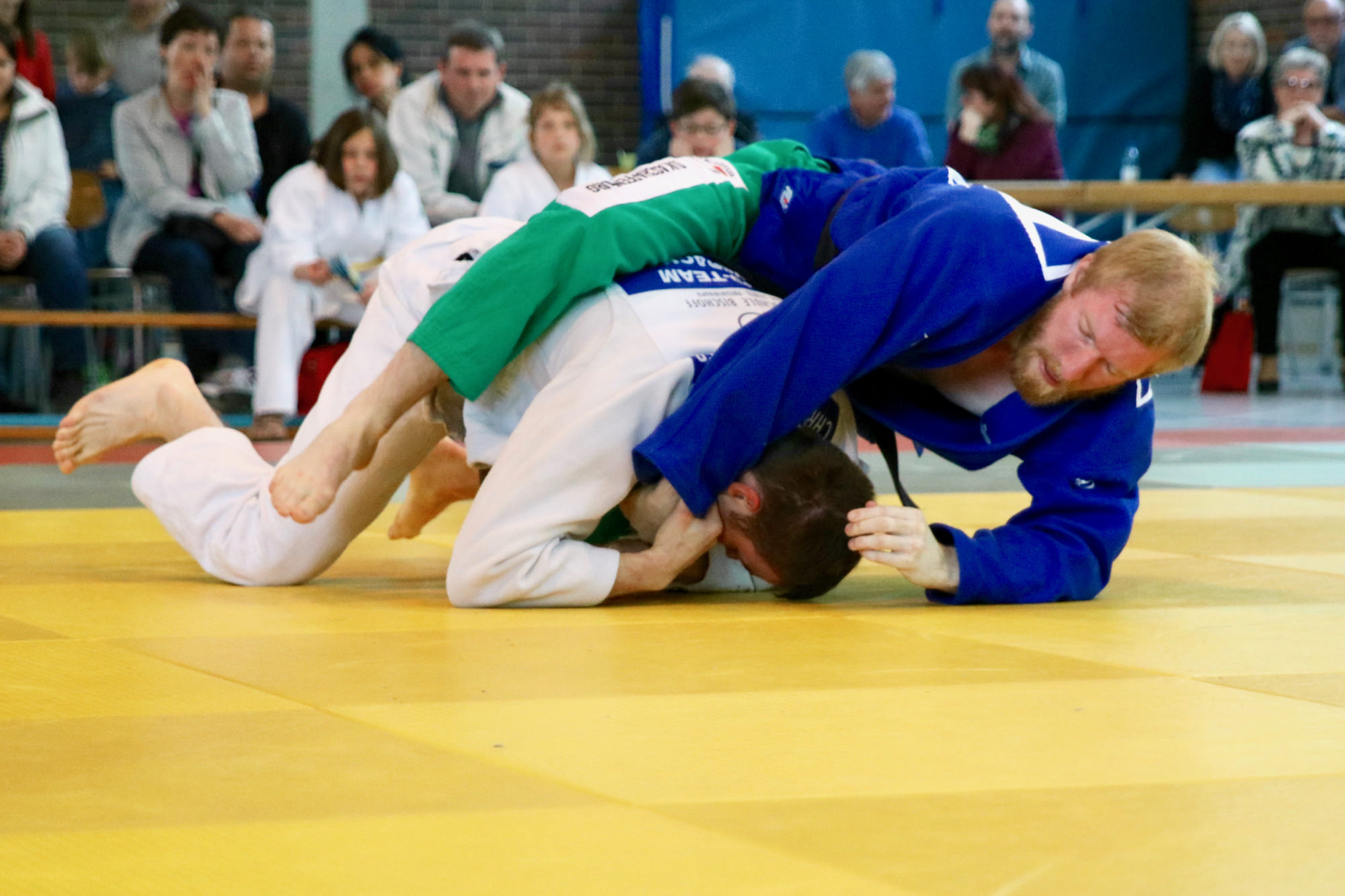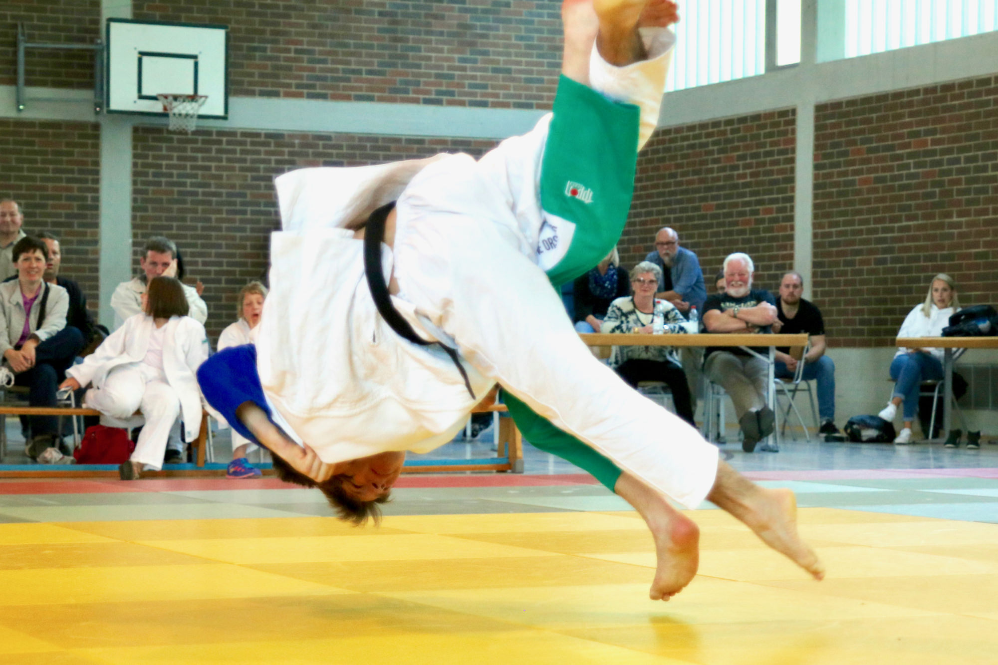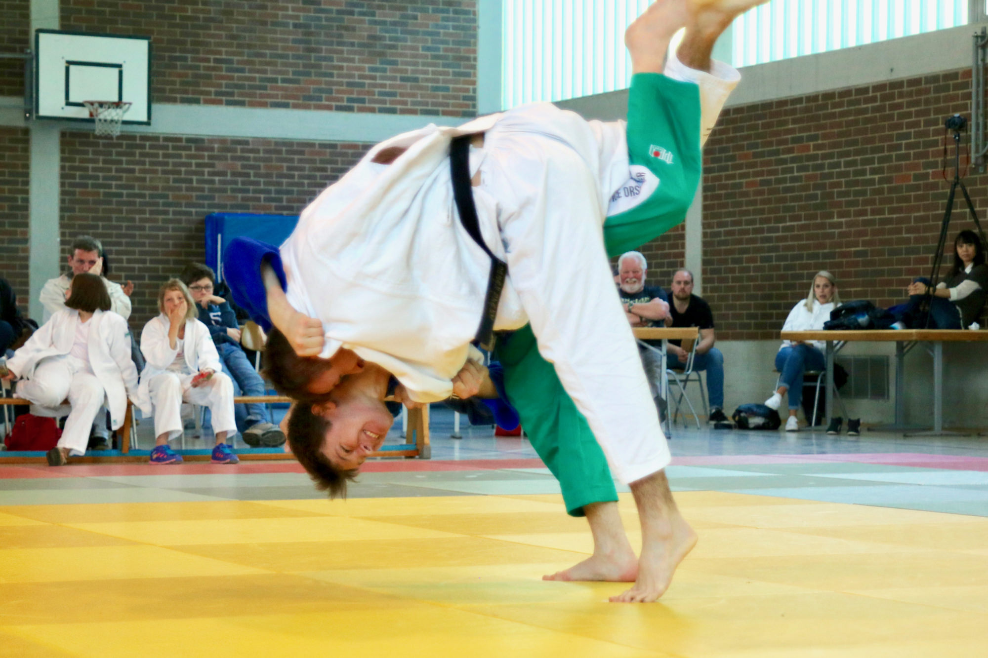 Dass es diesmal knapper werden würde als beim 15:5 Heimsieg vor vier Wochen war allen klar. Umso erfreulicher, dass David Flörchinger (-81 kg) seinen ersten Kampf gewinnen konnte. Auch Uli Brand (-81 kg) und Tom Junker (-73 kg) holten ihre Punkte, so dass die DJK einen guten Start erwischte. Nachdem der zweite Kampf -73 kg an die Gäste gegangen war, holte Marcus Kaiser (+90 kg) den vierten Punkt für die Gastgeber in gewohnter Manier: Er wartete überlegt ab, ließ den Gegner kommen und nutzte dann den perfekten Augenblick für seine Technik, diesmal ein Konter, der ihm den Ippon zum vorzeitigen Sieg brachte. Punkt Nummer 5 holte anschließend Patrick Dobai-Krecht (+90 kg) im Boden. Im Leichtgewicht (-66 kg) konnten die Gäste zwei Punkte aufholen. Lukas Ühlein lieferte dabei trotz seiner „nur“ 55 kg seinem fast 10 kg schwereren Gegner einen derart guten Kampf, dass er sogar Chancen gehabt hätte, zu gewinnen, wäre er nicht durch eine unglückliche Kampfrichterentscheidung mit einem zweiten Waza-ari in Rückstand geraten. In der letzten Gewichtsklasse des ersten Durchgangs konnte nur Niklas Kern punkten, das jedoch mit gewohnter Souveränität, so dass die DJK Aschaffenburg mit einer knappen, aber vielversprechenden 6:4 Führung in die Pause ging.