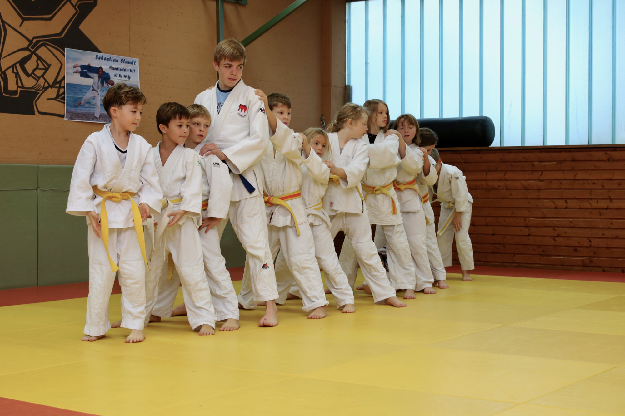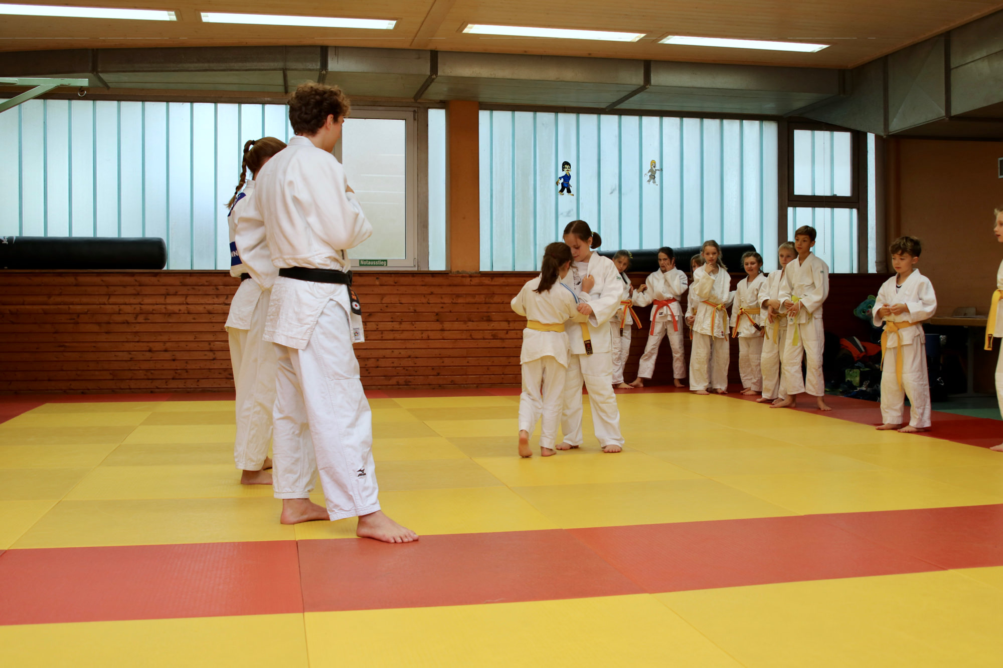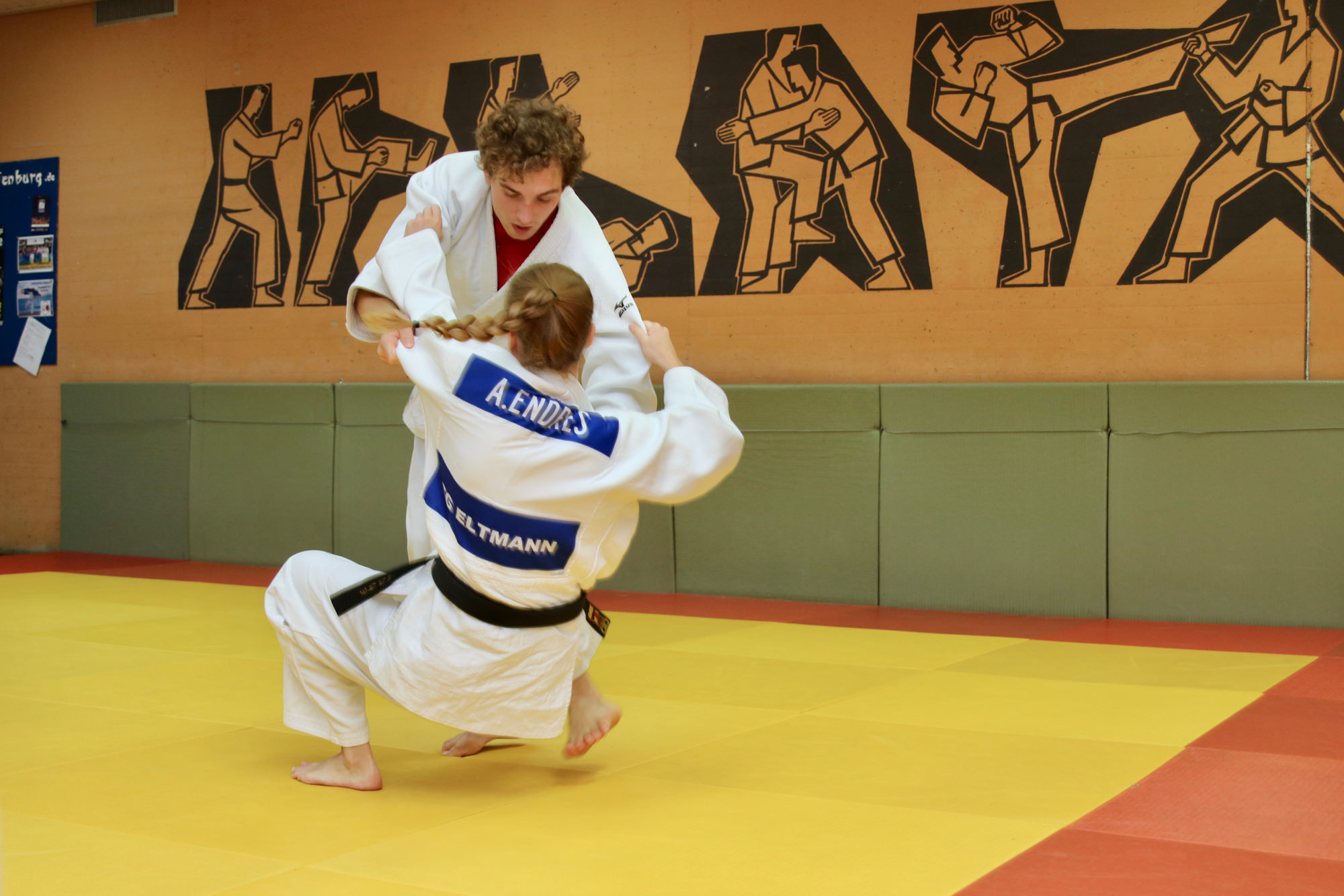 Gleich die erste Einheit übernahmen David Zöller und Anne Endres vom JC Obernburg – beide kämpfen aktiv in der 2. Bundesliga. Unter ihrer Anleitung lernten die Kids zwei bekannte Techniken – O-uchi-gari und Seoi-otoshi/Seoi-nage – zu einer eleganten Kombination zu verbinden. Nach einer Stärkung im Clubraum ging es dann zu Fuß in die Eishalle, die wir als große Gruppe ordentlich aufgemischt haben. Ganz im Sinne der Judowerte haben dabei die Kinder, die schon Schlittschuhfahren konnten, denjenigen geholfen, die zum ersten Mal auf dem Eis standen. Nach dem Rückweg zum DJK Gelände war der Hunger schon wieder so groß, dass sich alle erst einmal mit einem Stück Kuchen stärken mussten. Der Nachmittag fand seinen Abschluss mit einer Boden-Einheit, bei Jonas Ludwig den einfachen aber sehr effektiven „Bauernfänger“ unterrichtet hat. Mit dieser Technik kann man aus der eigenen Banklage den angreifenden Partner schnell umdrehen und selbst im Haltegriff festhalten.