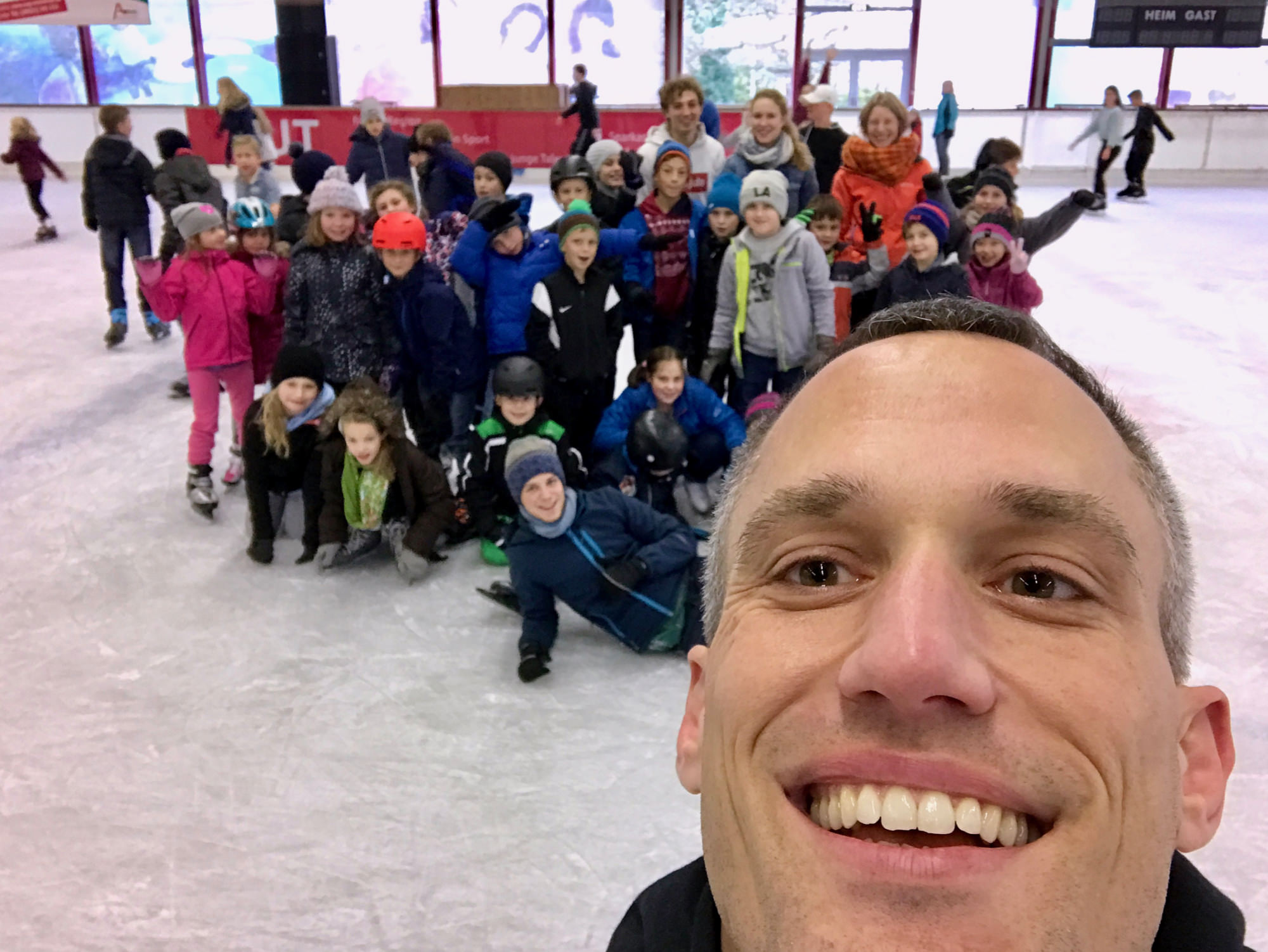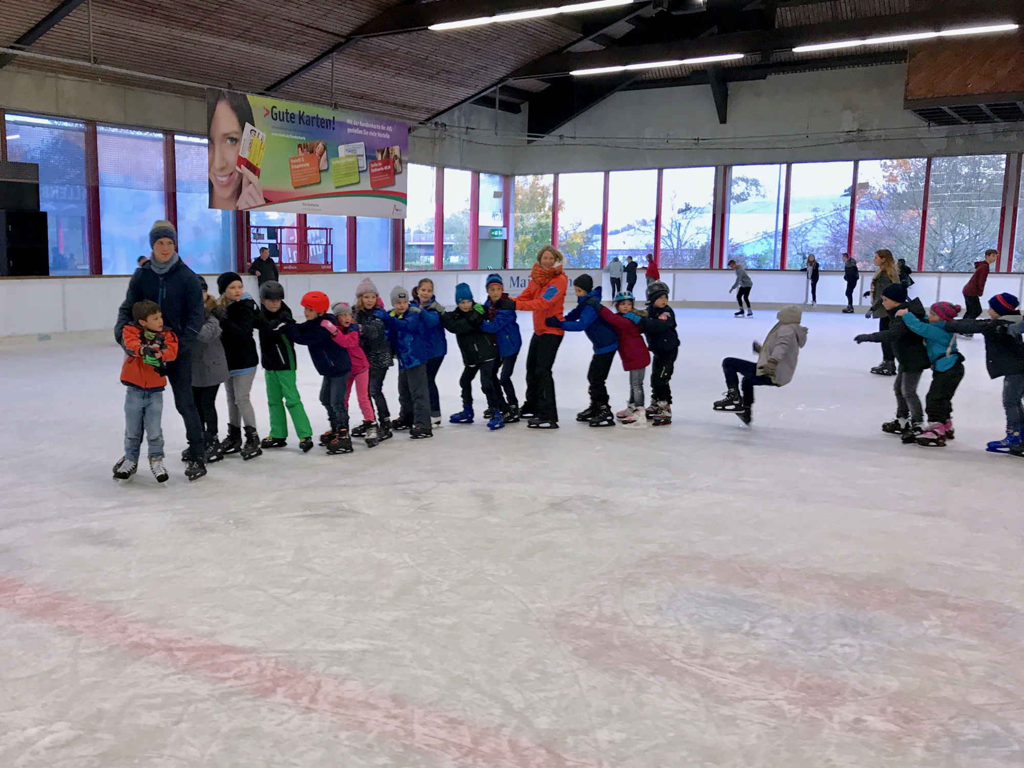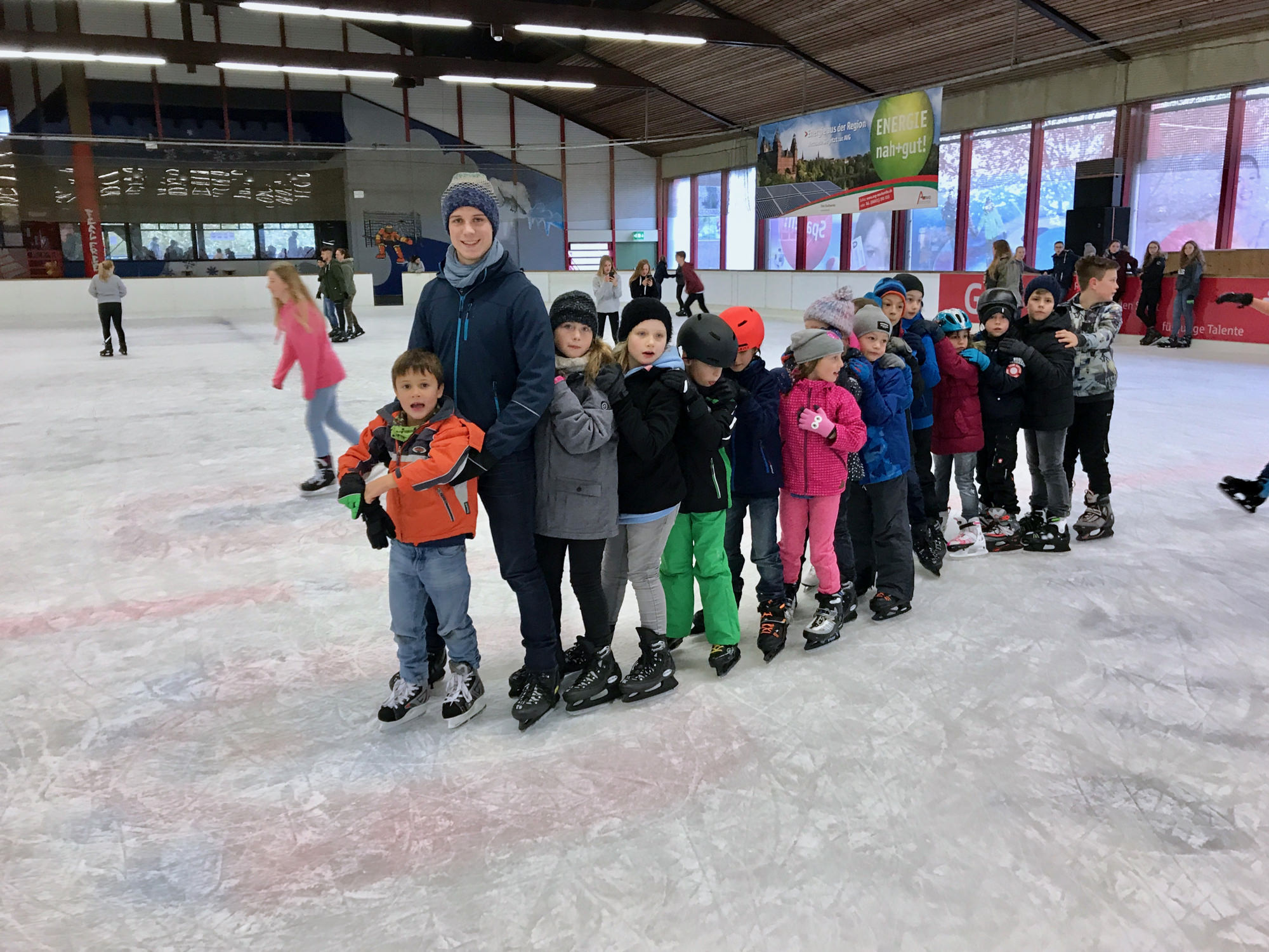 Gleich die erste Einheit übernahmen David Zöller und Anne Endres vom JC Obernburg – beide kämpfen aktiv in der 2. Bundesliga. Unter ihrer Anleitung lernten die Kids zwei bekannte Techniken – O-uchi-gari und Seoi-otoshi/Seoi-nage – zu einer eleganten Kombination zu verbinden. Nach einer Stärkung im Clubraum ging es dann zu Fuß in die Eishalle, die wir als große Gruppe ordentlich aufgemischt haben. Ganz im Sinne der Judowerte haben dabei die Kinder, die schon Schlittschuhfahren konnten, denjenigen geholfen, die zum ersten Mal auf dem Eis standen. Nach dem Rückweg zum DJK Gelände war der Hunger schon wieder so groß, dass sich alle erst einmal mit einem Stück Kuchen stärken mussten. Der Nachmittag fand seinen Abschluss mit einer Boden-Einheit, bei Jonas Ludwig den einfachen aber sehr effektiven „Bauernfänger“ unterrichtet hat. Mit dieser Technik kann man aus der eigenen Banklage den angreifenden Partner schnell umdrehen und selbst im Haltegriff festhalten.