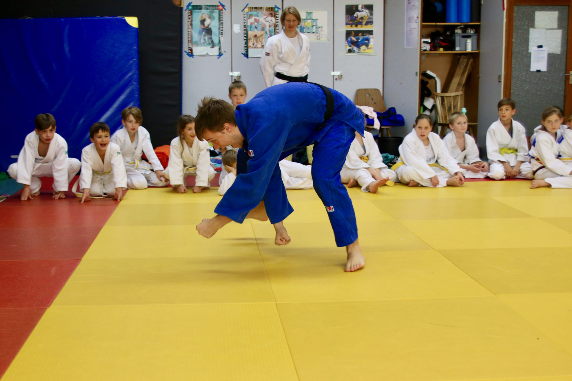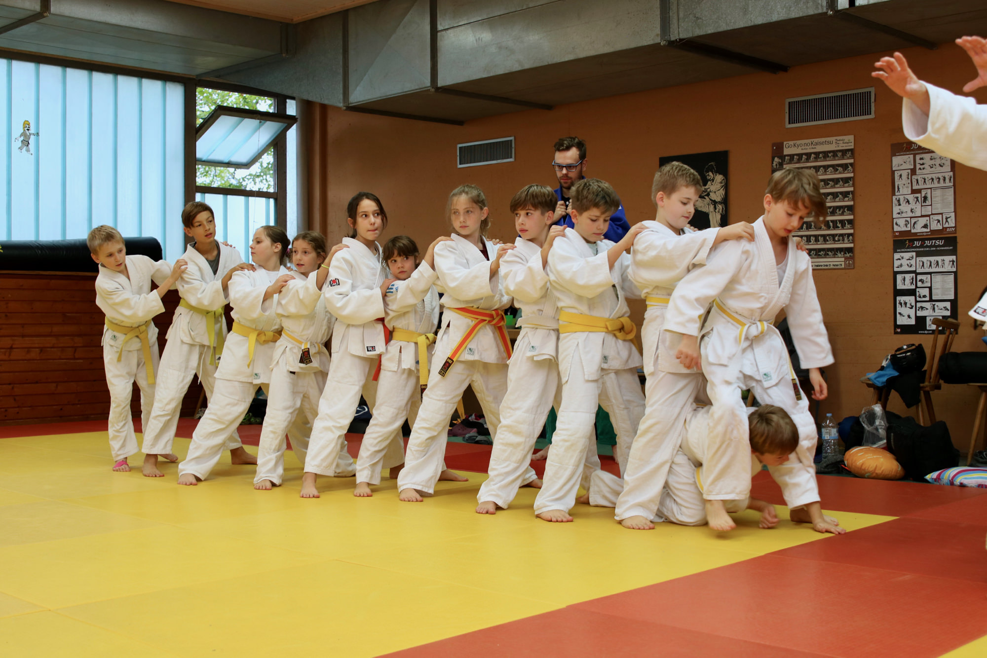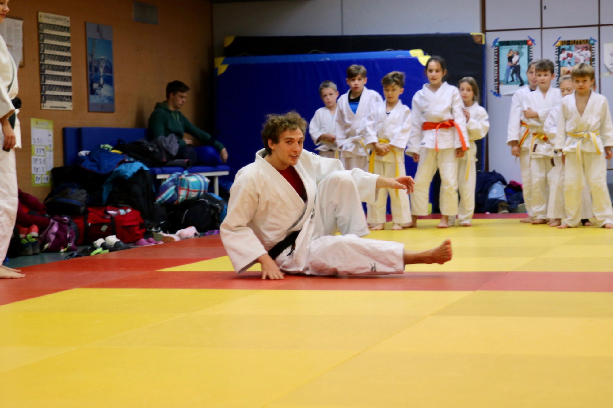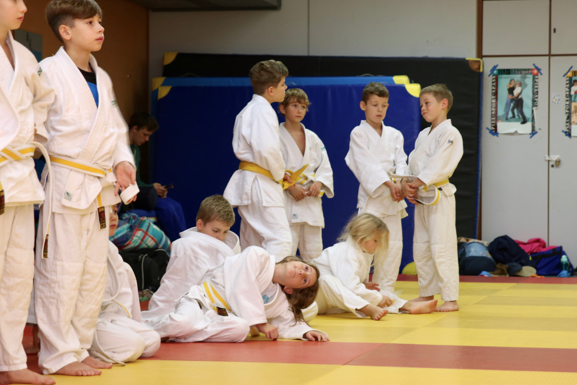 Nachdem das Zombieproblem abschließend gelöst war, haben alle ihre letzten Reserven mobilisiert und vor dem Mittagessen noch einmal alle Techniken aus dem Lehrgang wiederholt, bevor es mit einer Partnermassage auf die Zielgerade des Lehrgangs ging. Zum Mittagessen gab es Nudeln mit Tomatensoße und die frisch gestärkten Judoka fanden sich am frühen Nachmittag ein letztes Mal auf der Matte ein. Mit Koordinationsübungen haben wir den Kreislauf noch einmal ein wenig in Schwung gebracht, damit wir den Sonntagnachmittag mit Spielen und viel Spaß ausklingen lassen konnten. Den Höhepunkt bildete dabei der Wallflip – ein Rückwärtssalto bei dem man die Wand hochläuft. Glücklich und fachgerecht geplättet haben die Eltern dann ihre Kinder um 16.00 Uhr wieder in Empfang genommen.