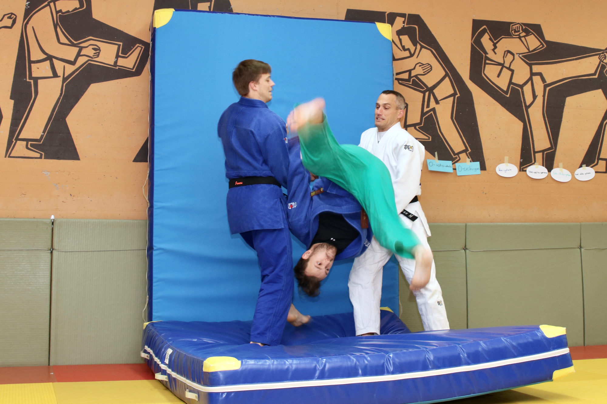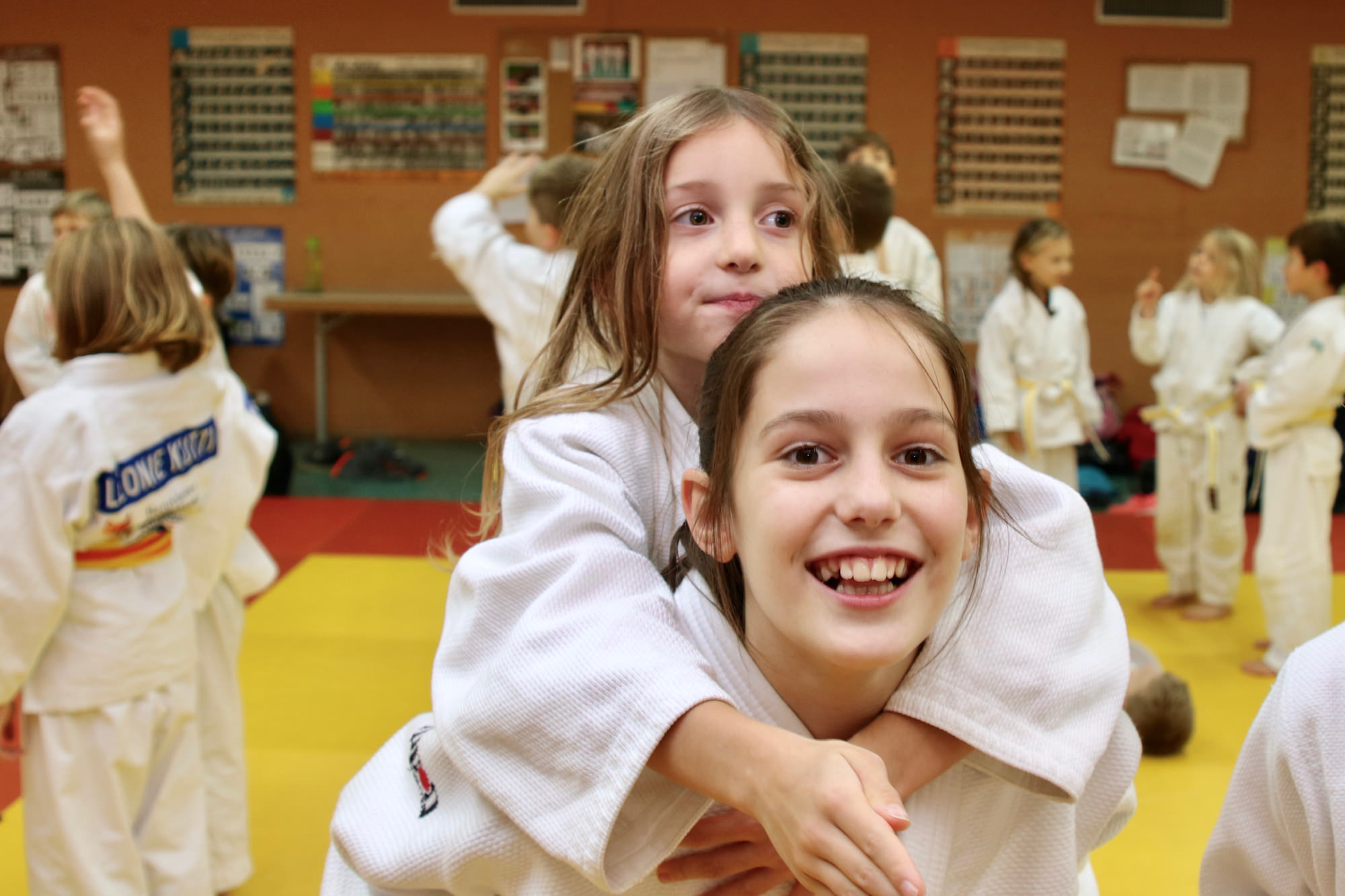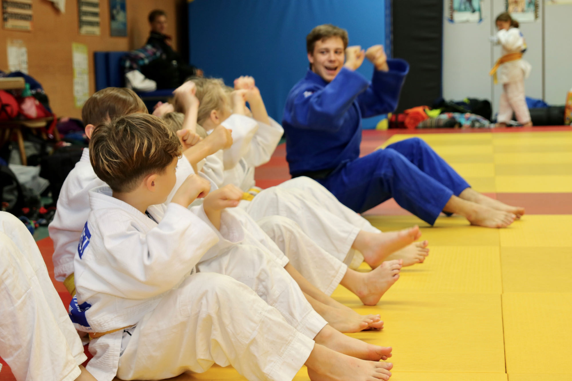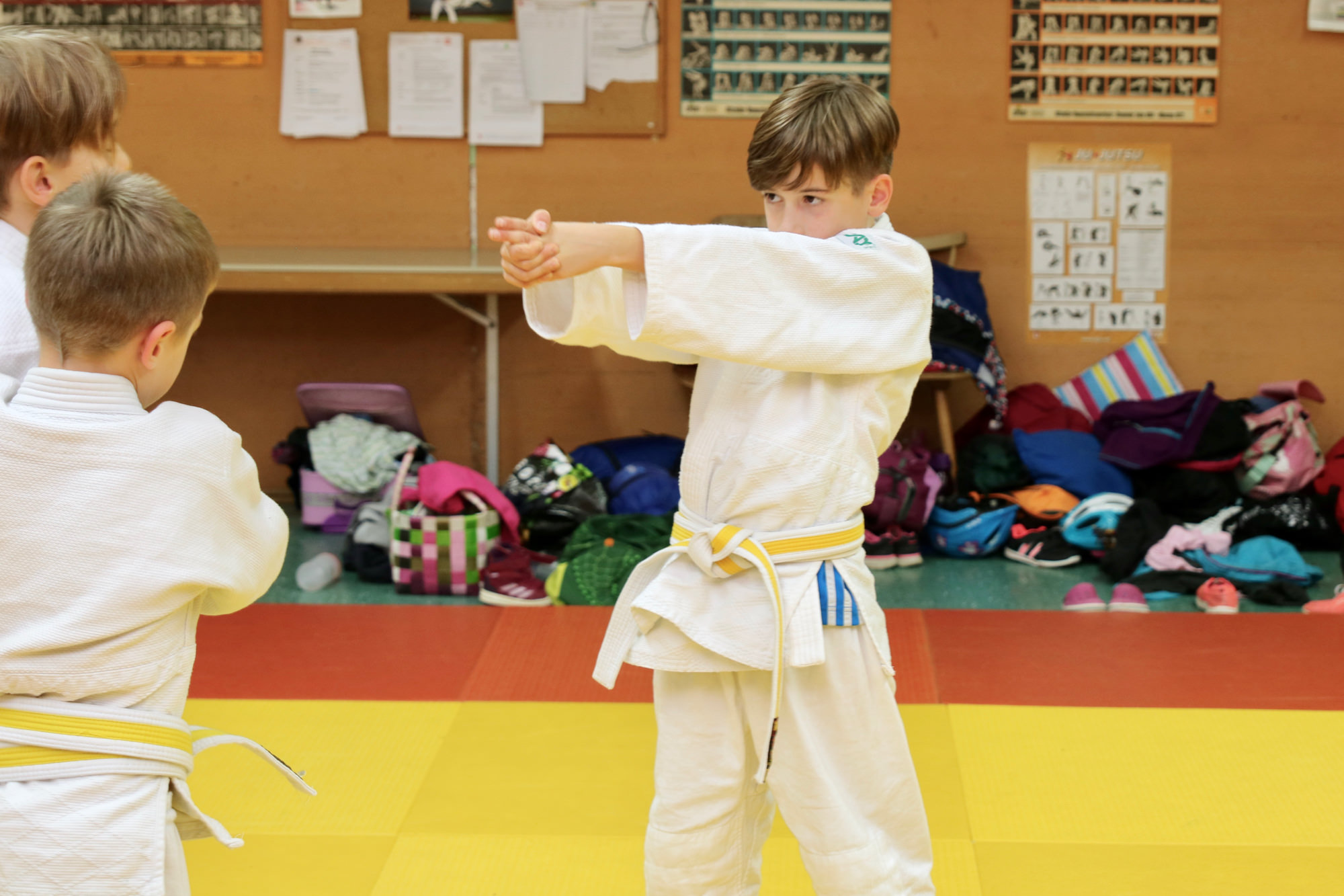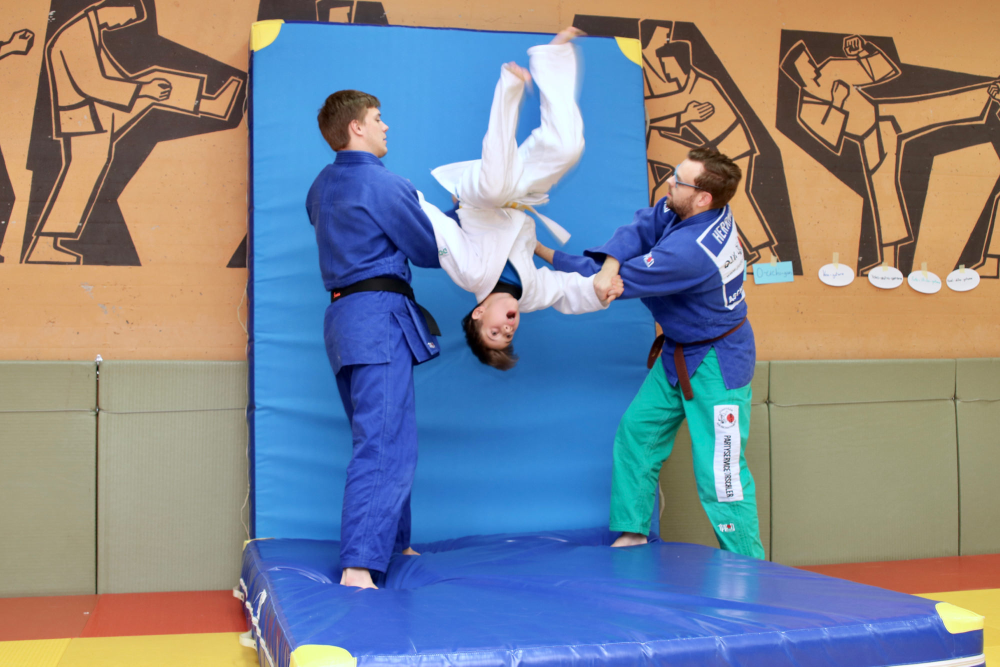 Nachdem das Zombieproblem abschließend gelöst war, haben alle ihre letzten Reserven mobilisiert und vor dem Mittagessen noch einmal alle Techniken aus dem Lehrgang wiederholt, bevor es mit einer Partnermassage auf die Zielgerade des Lehrgangs ging. Zum Mittagessen gab es Nudeln mit Tomatensoße und die frisch gestärkten Judoka fanden sich am frühen Nachmittag ein letztes Mal auf der Matte ein. Mit Koordinationsübungen haben wir den Kreislauf noch einmal ein wenig in Schwung gebracht, damit wir den Sonntagnachmittag mit Spielen und viel Spaß ausklingen lassen konnten. Den Höhepunkt bildete dabei der Wallflip – ein Rückwärtssalto bei dem man die Wand hochläuft. Glücklich und fachgerecht geplättet haben die Eltern dann ihre Kinder um 16.00 Uhr wieder in Empfang genommen.