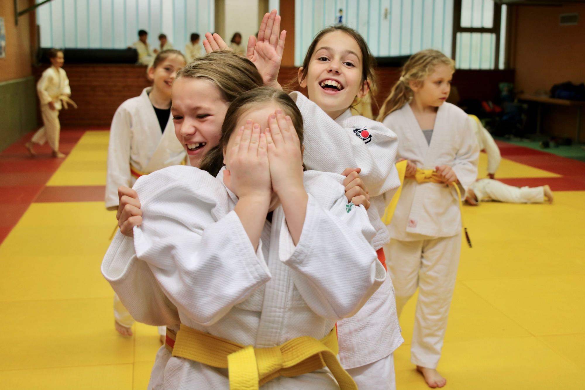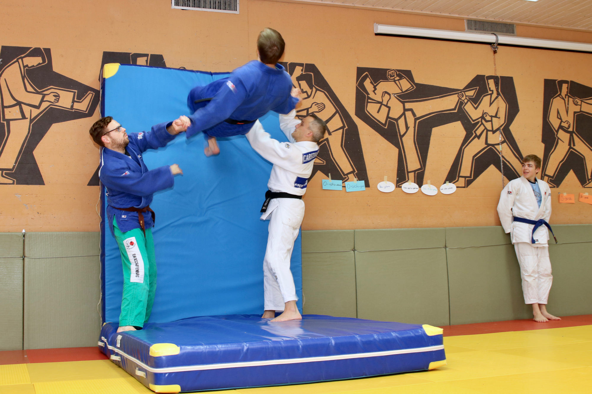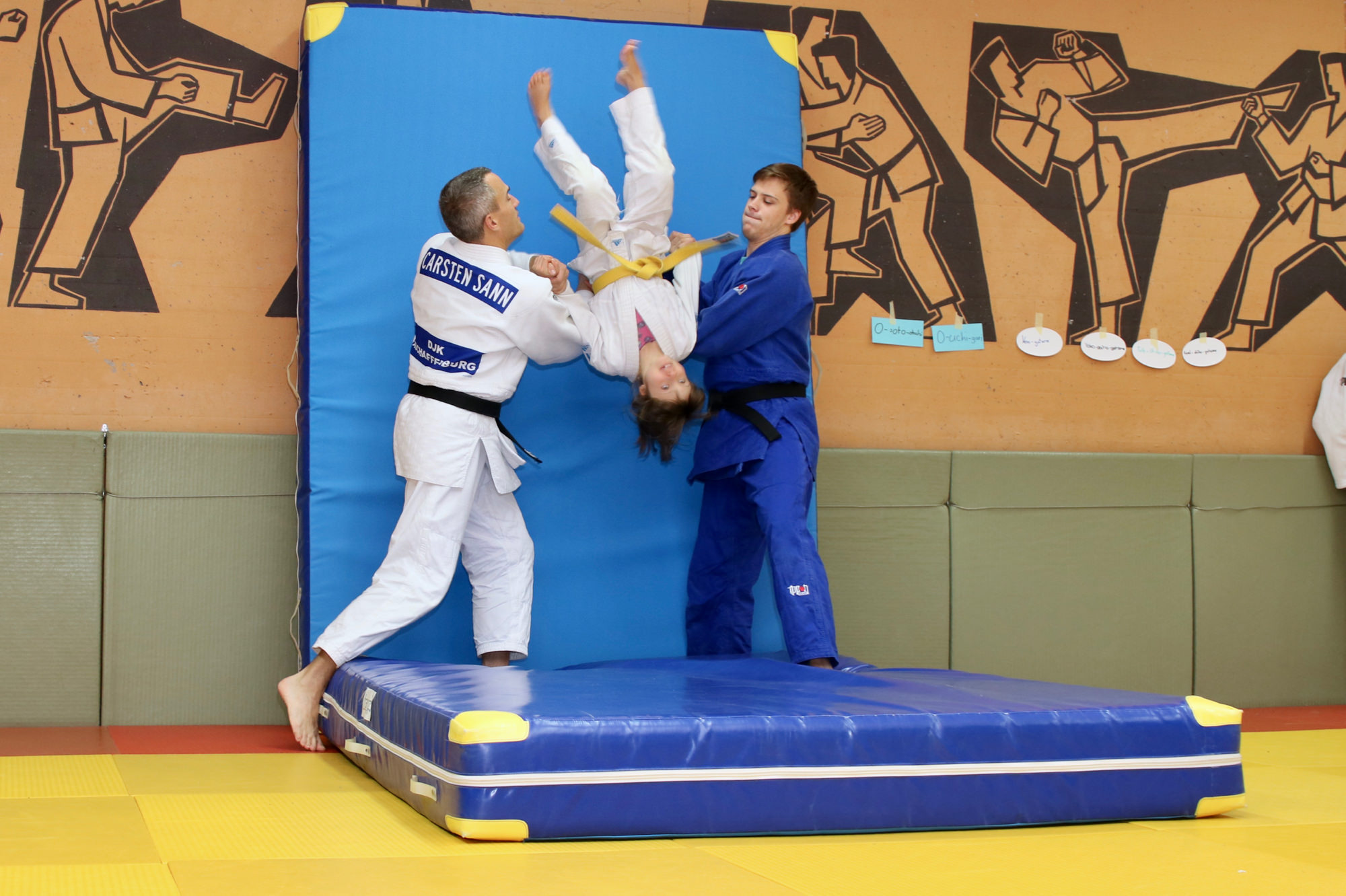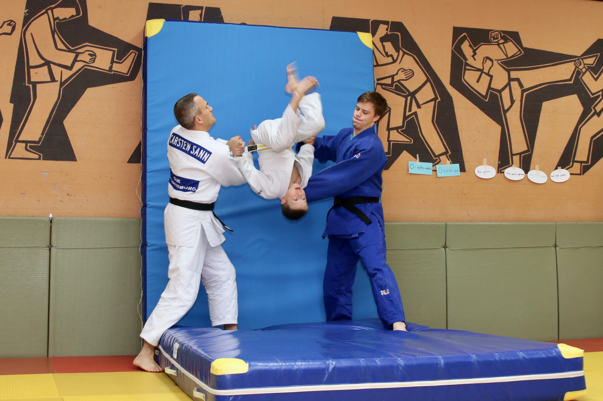 Nachdem das Zombieproblem abschließend gelöst war, haben alle ihre letzten Reserven mobilisiert und vor dem Mittagessen noch einmal alle Techniken aus dem Lehrgang wiederholt, bevor es mit einer Partnermassage auf die Zielgerade des Lehrgangs ging. Zum Mittagessen gab es Nudeln mit Tomatensoße und die frisch gestärkten Judoka fanden sich am frühen Nachmittag ein letztes Mal auf der Matte ein. Mit Koordinationsübungen haben wir den Kreislauf noch einmal ein wenig in Schwung gebracht, damit wir den Sonntagnachmittag mit Spielen und viel Spaß ausklingen lassen konnten. Den Höhepunkt bildete dabei der Wallflip – ein Rückwärtssalto bei dem man die Wand hochläuft. Glücklich und fachgerecht geplättet haben die Eltern dann ihre Kinder um 16.00 Uhr wieder in Empfang genommen.