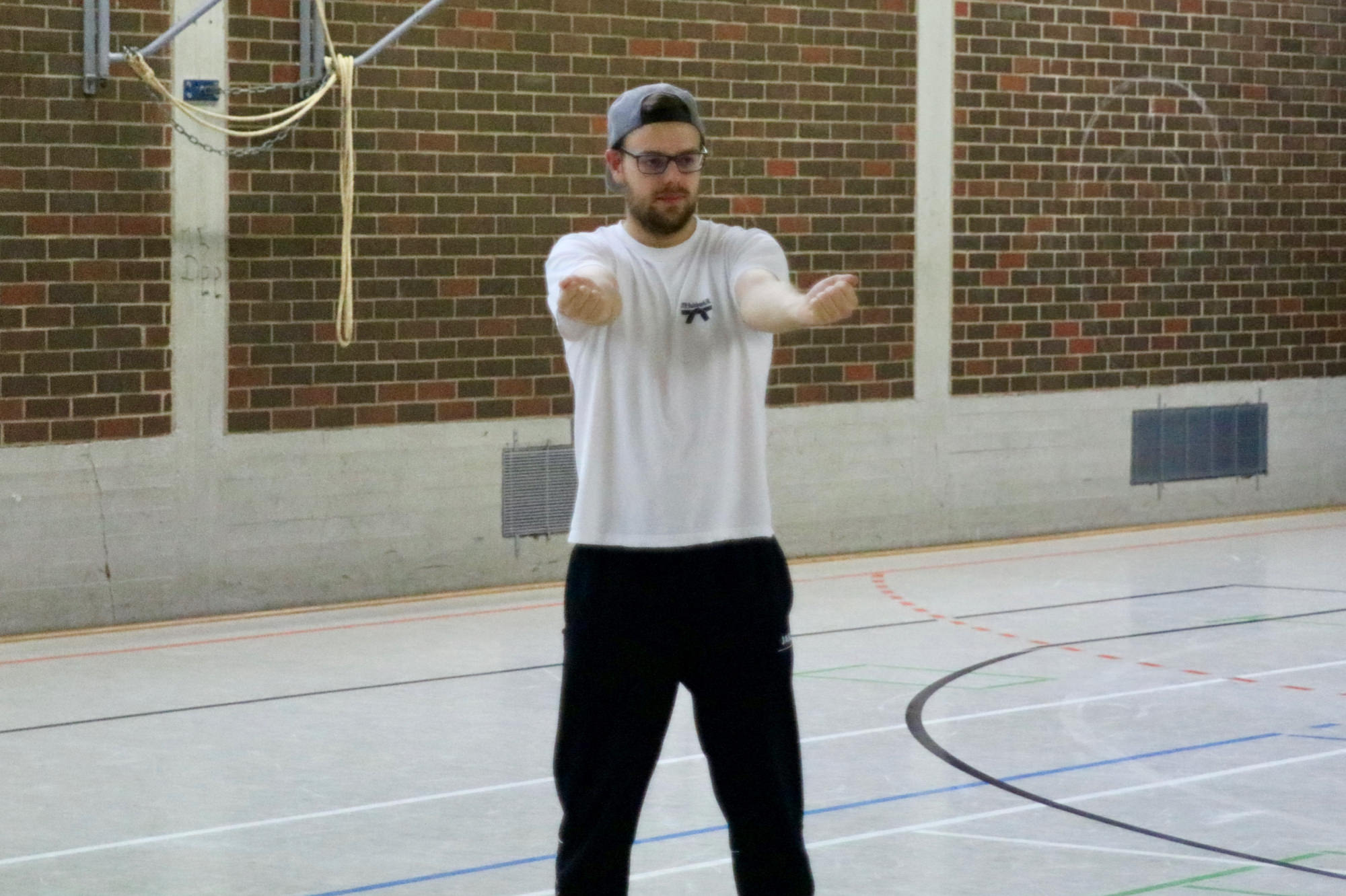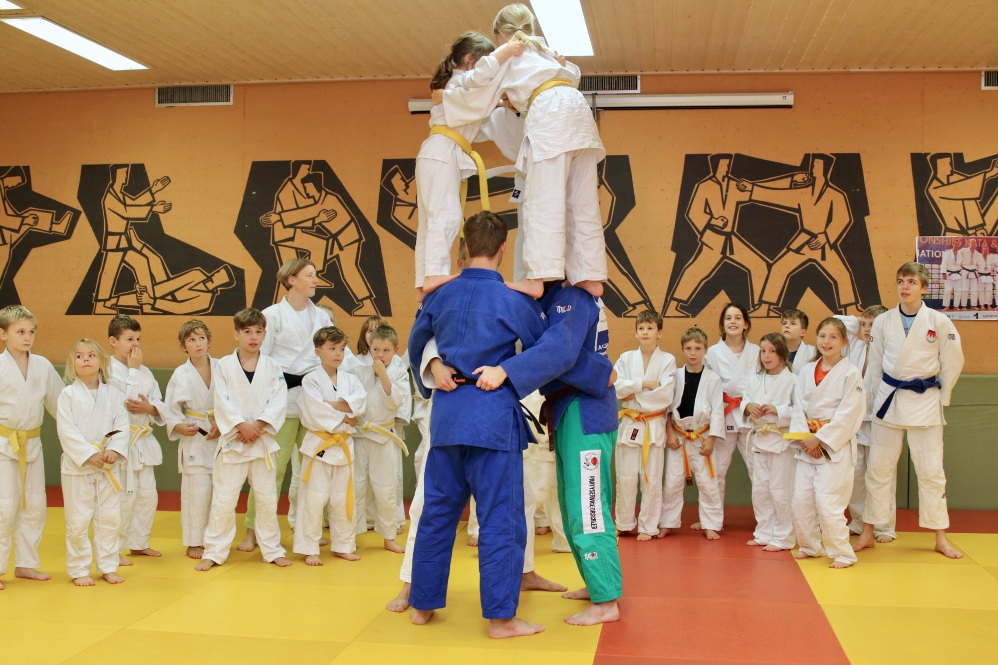 Zum Abendessen belieferte uns Luciano von der DJK Gaststätte traditionell mit Pizza. So gestärkt ging es dann in die letzte Einheit des Tages. Auf dem Programm stand unter dem Titel „Mattenzirkus“ eine Einheit Partnerakrobatik mit Carsten Sann. Den Ausklang des ersten Tages bildete gemeinsames chillen, und obwohl alle müde waren, dauerte es noch fast bis Mitternacht, bis wirklich Ruhe einkehrte.