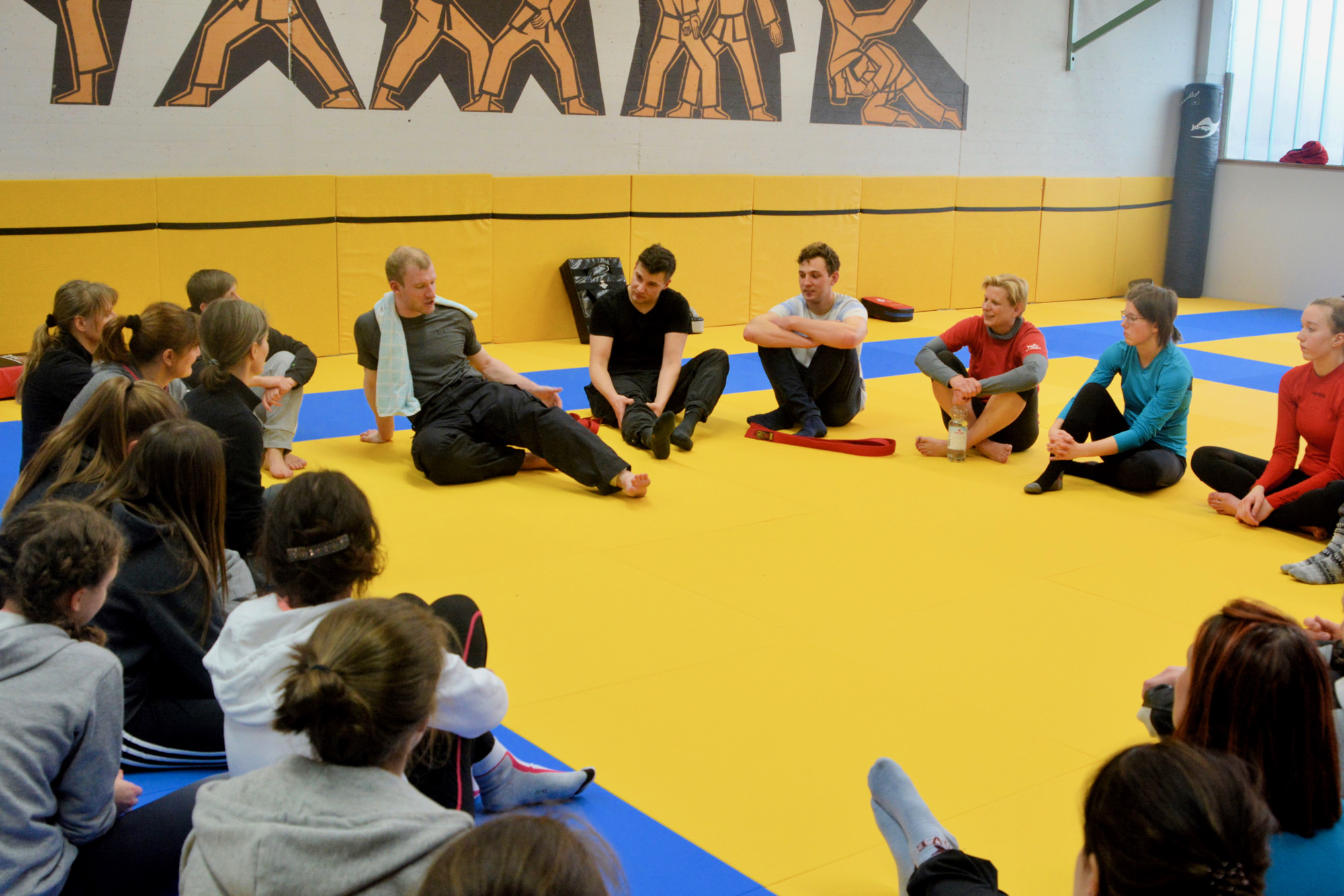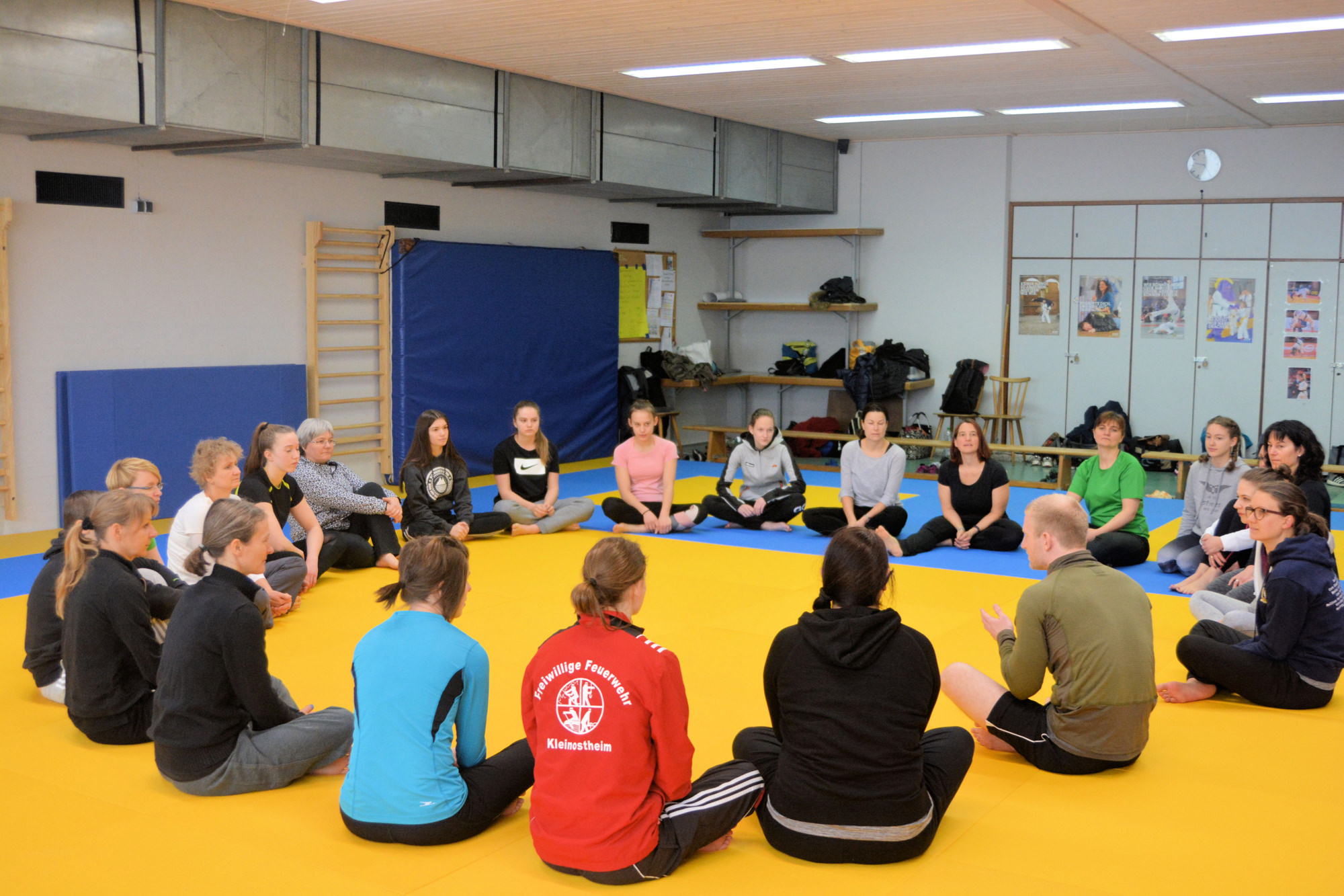 Der Tagesworkshop war ausgeschrieben für Frauen und junge Damen. Voraussetzungen irgendwelcher Art gab es keine und die 25 Teilnehmerinnen fanden sich am Samstagmorgen teils mit mulmigem Gefühl im Dojo der DJK Aschaffenburg ein, schließlich wussten sie außer dem Thema nicht genau, was auf sie zukommen würde.