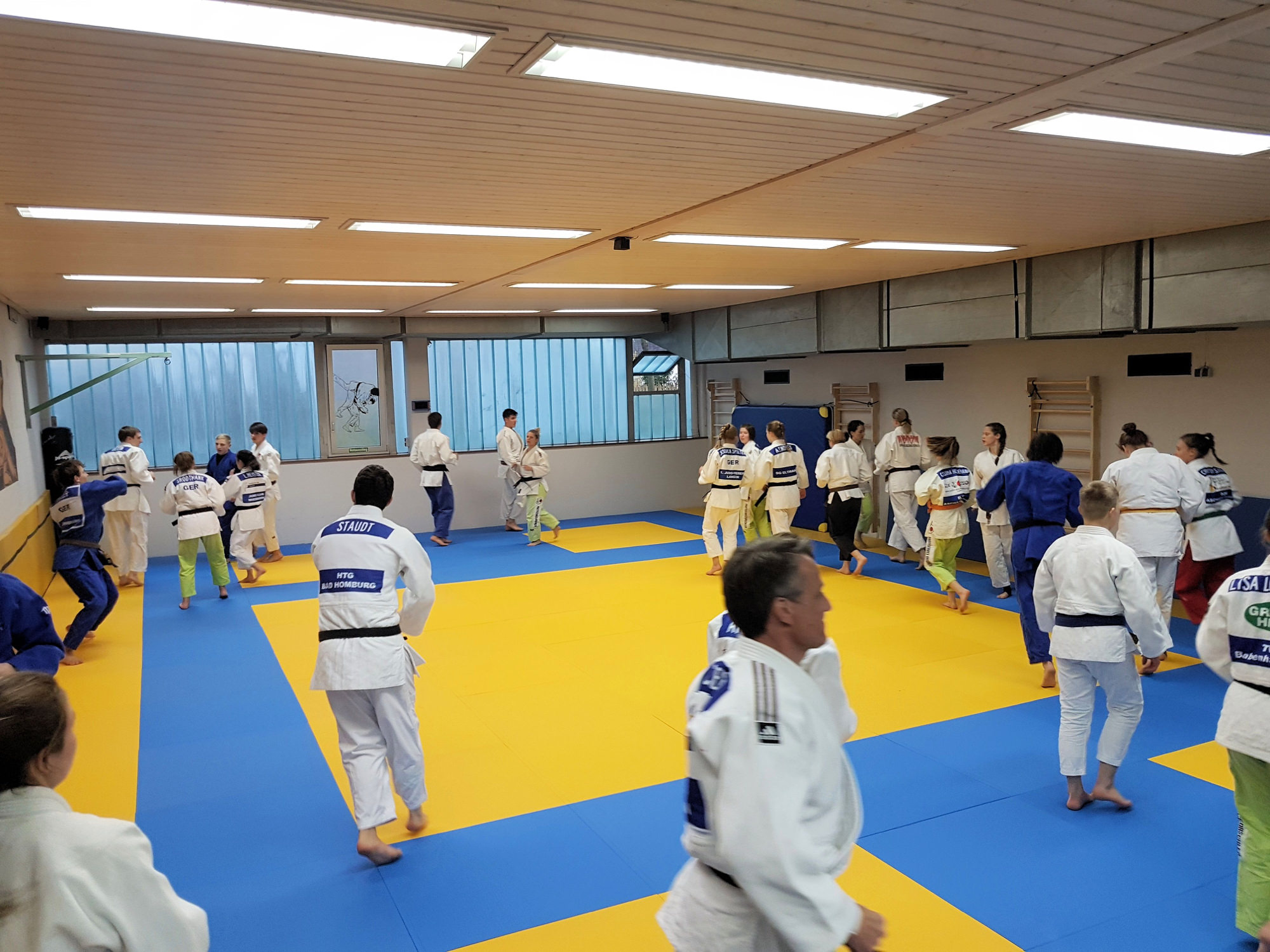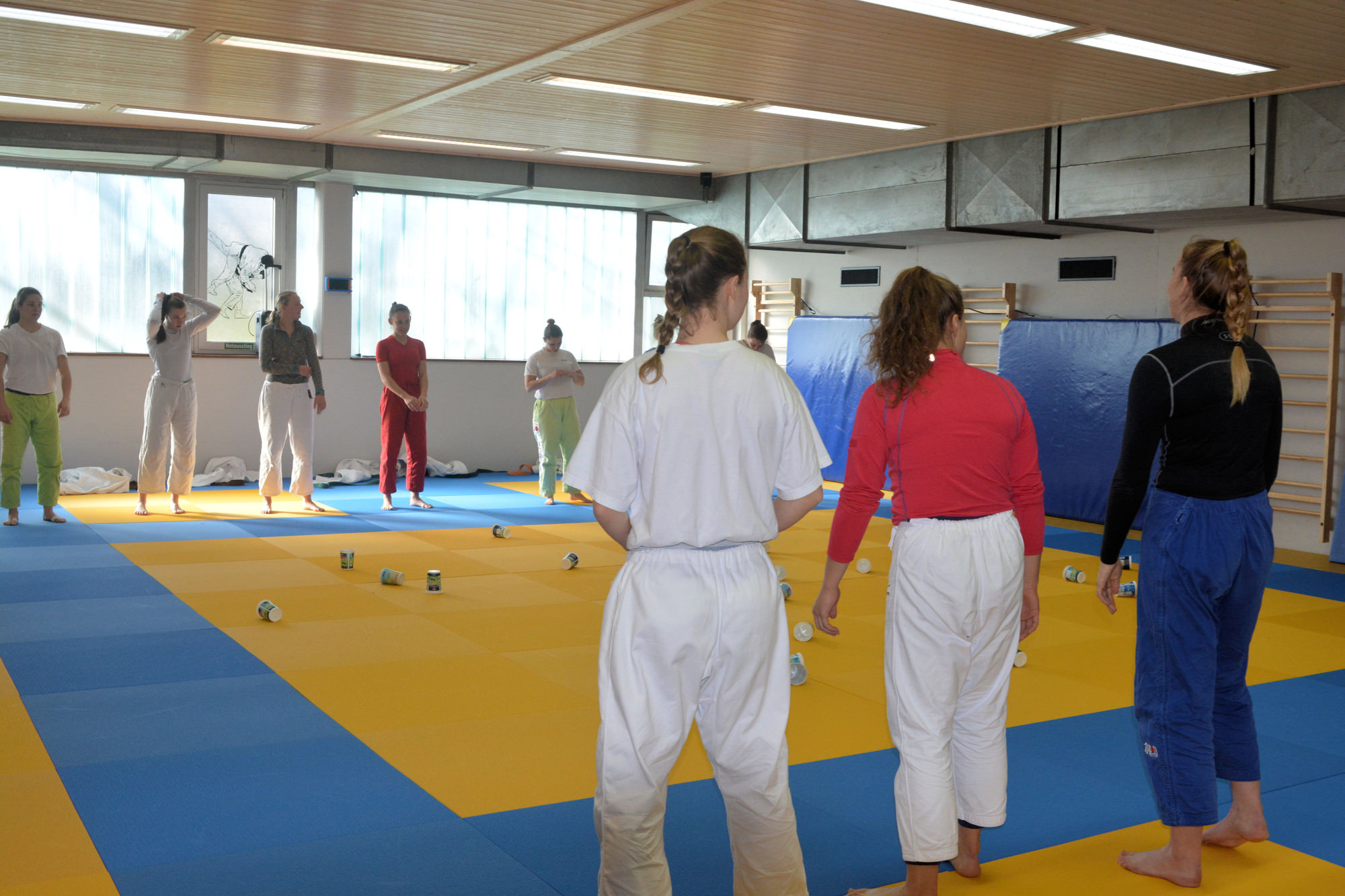 Während der regulären Trainingszeit am Freitagabend platze das Dojo gleich aus allen Nähten, denn natürlich wollten auch die Männer trainieren. Nach einem koronaren Aufwärmen mit anschließenden turnerischen Übungen trennten sich die Geschlechter, und die Frauen wichen trotz zahlenmäßiger Überlegenheit für die Bodenrandoris in das Ersatzdojo im Tischtennisraum aus. Die Standtechniken wurden dann wieder gemeinsam im Wechsel trainiert. Nach Wurfautomatisierungen gab es noch für jede Gruppe acht Randoris. Ein Cool-Down mit der Blackroll rundete das zweistündige Training ab.