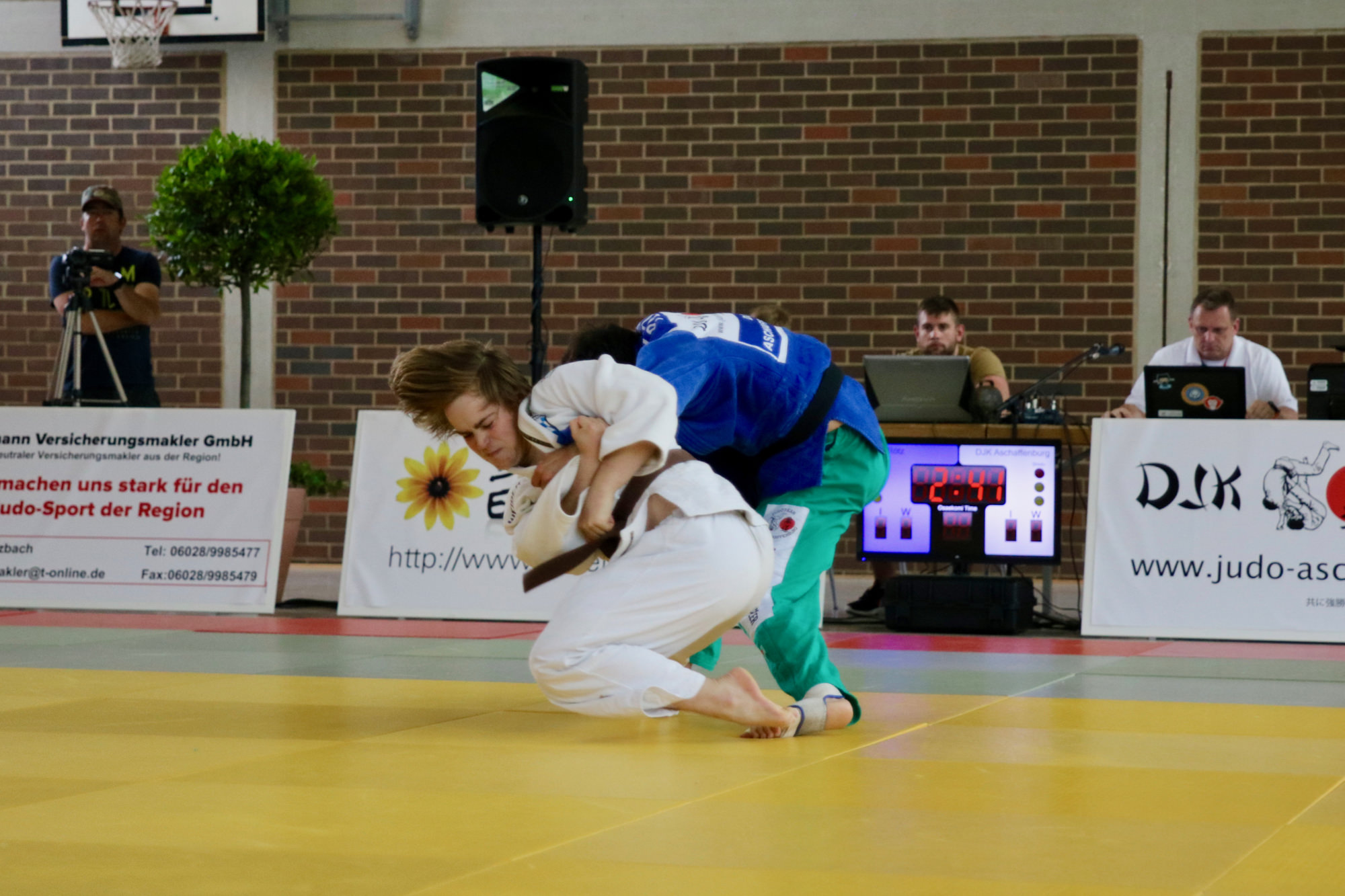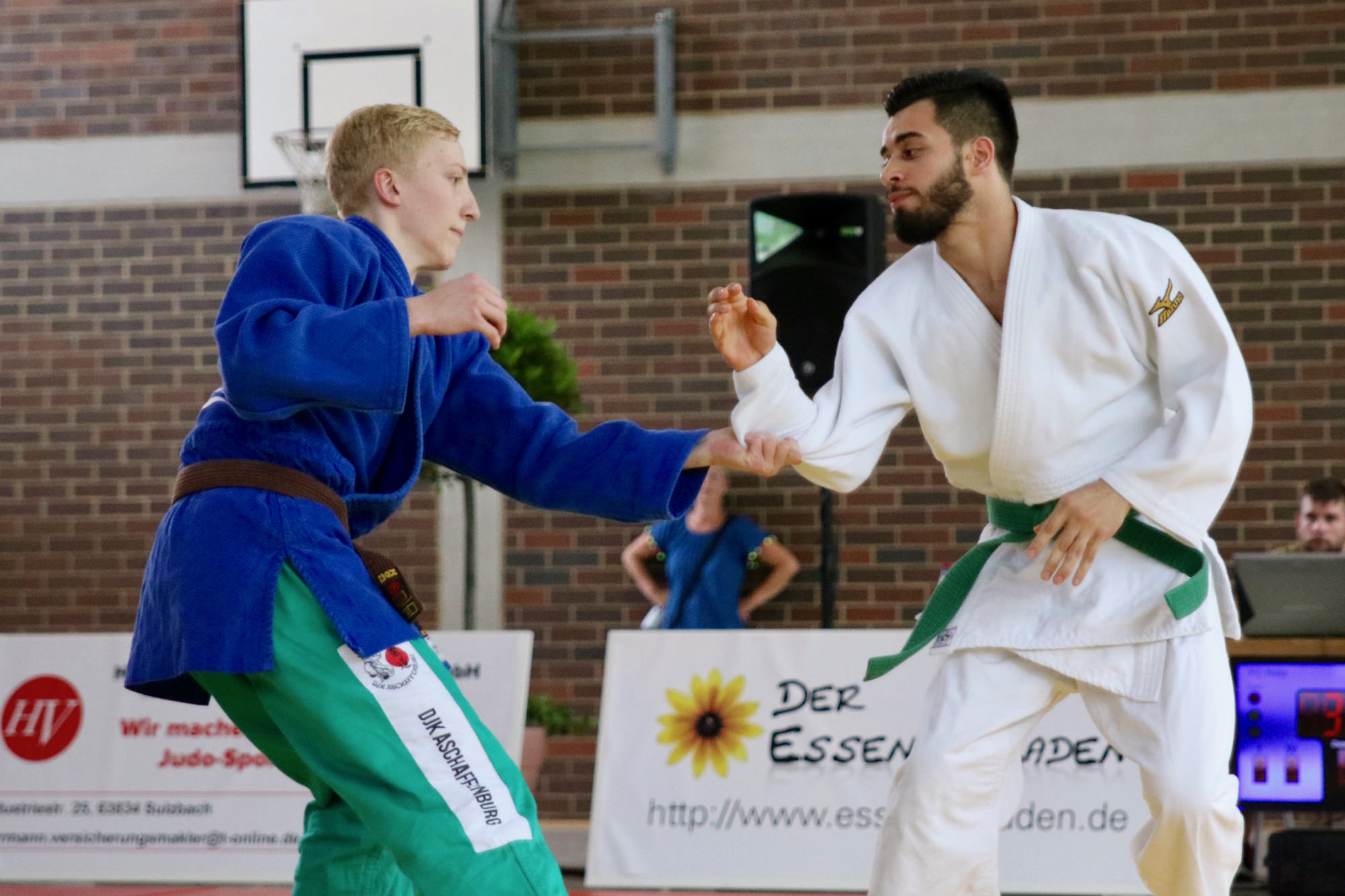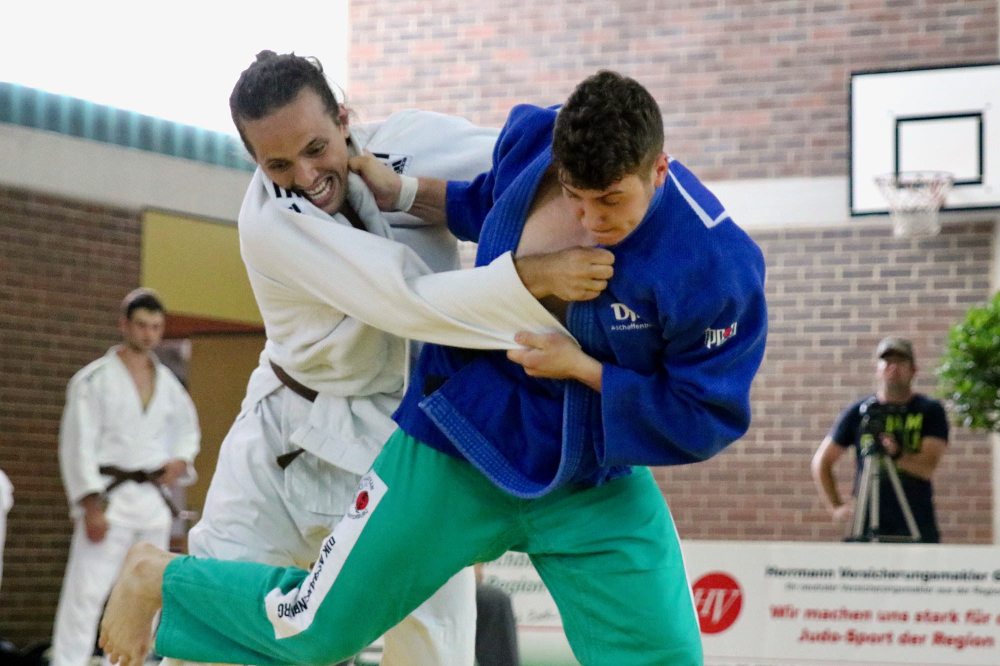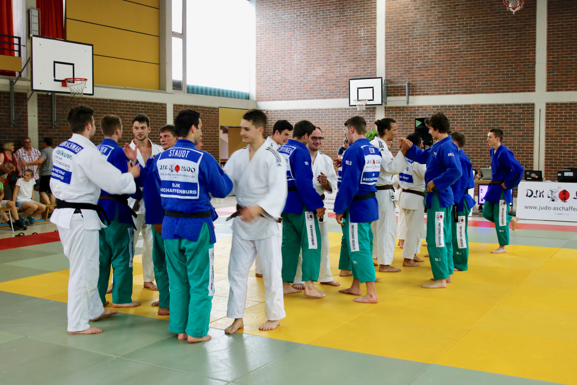 Marcel Herbert (-73 kg) eröffnete mit seinen Schulterwürfen die Begegnung gleich mit einem Sieg für die DJK Aschaffenburg. Nach drei Niederlagen gewannen die beiden 66er, Lukas Ühlein (per Shido) und Fabio Pecchia (Konter), jeweils ihre Kämpfe. Nach einer Niederlage von Sebastian Staudt, konnte Niklas Kern, der für seine Heim-Mannschaft auf den Bundesligakampf verzichtete, seine Begegnung mit taktischen Strafen gewinnen. Kevin Crichton, der ins Schwergewicht hochgestellt worden war, kämpfe gegen Robin Schwab wie ein Löwe, und gewann am Ende mit einem halben Punkt. Marco Senfleben, der ebenfalls ins Schwergewicht hochgerutscht war, machte den 6:4 Halbzeitstand mit einem fulminanten Hüftwurf klar.