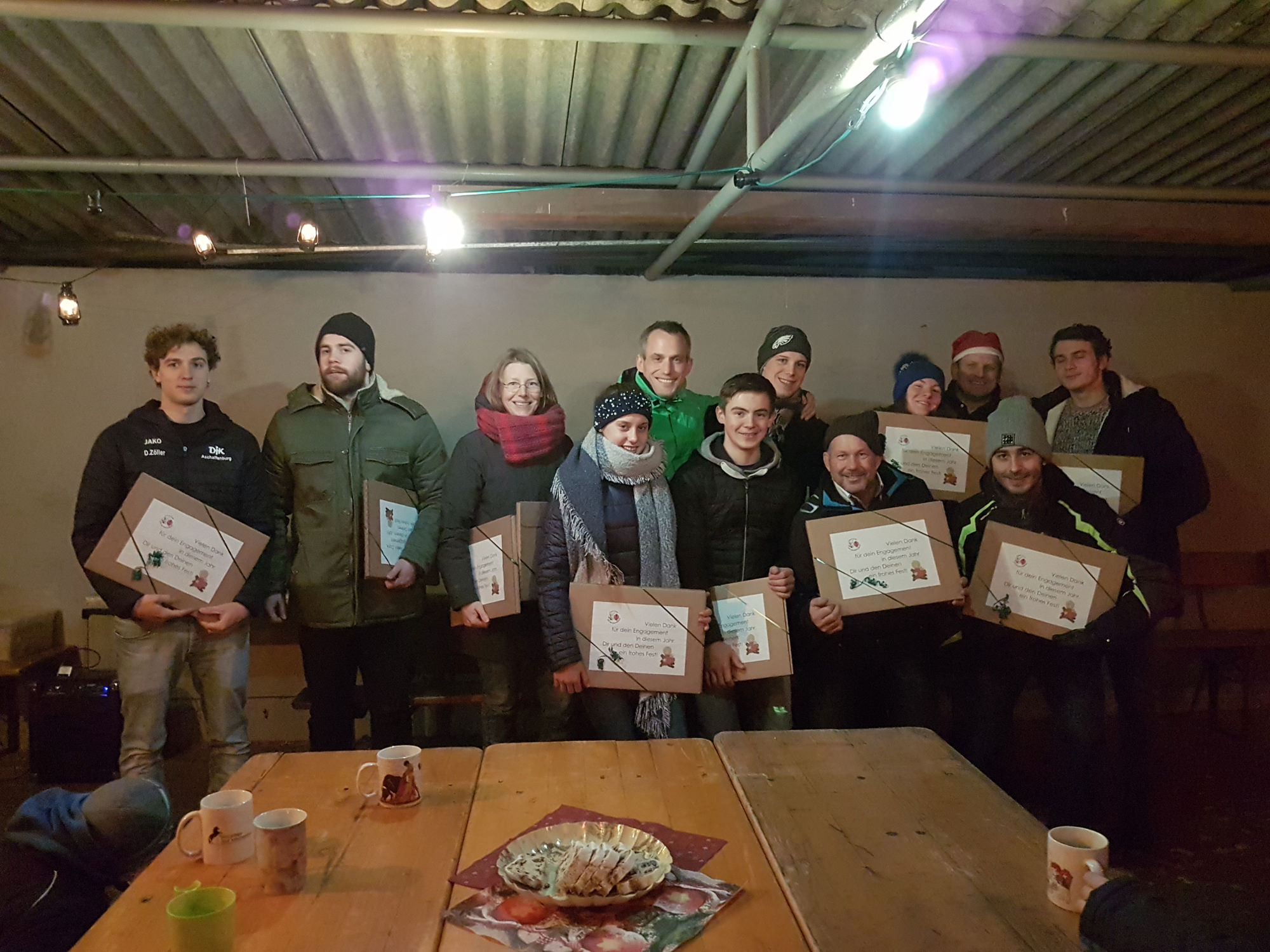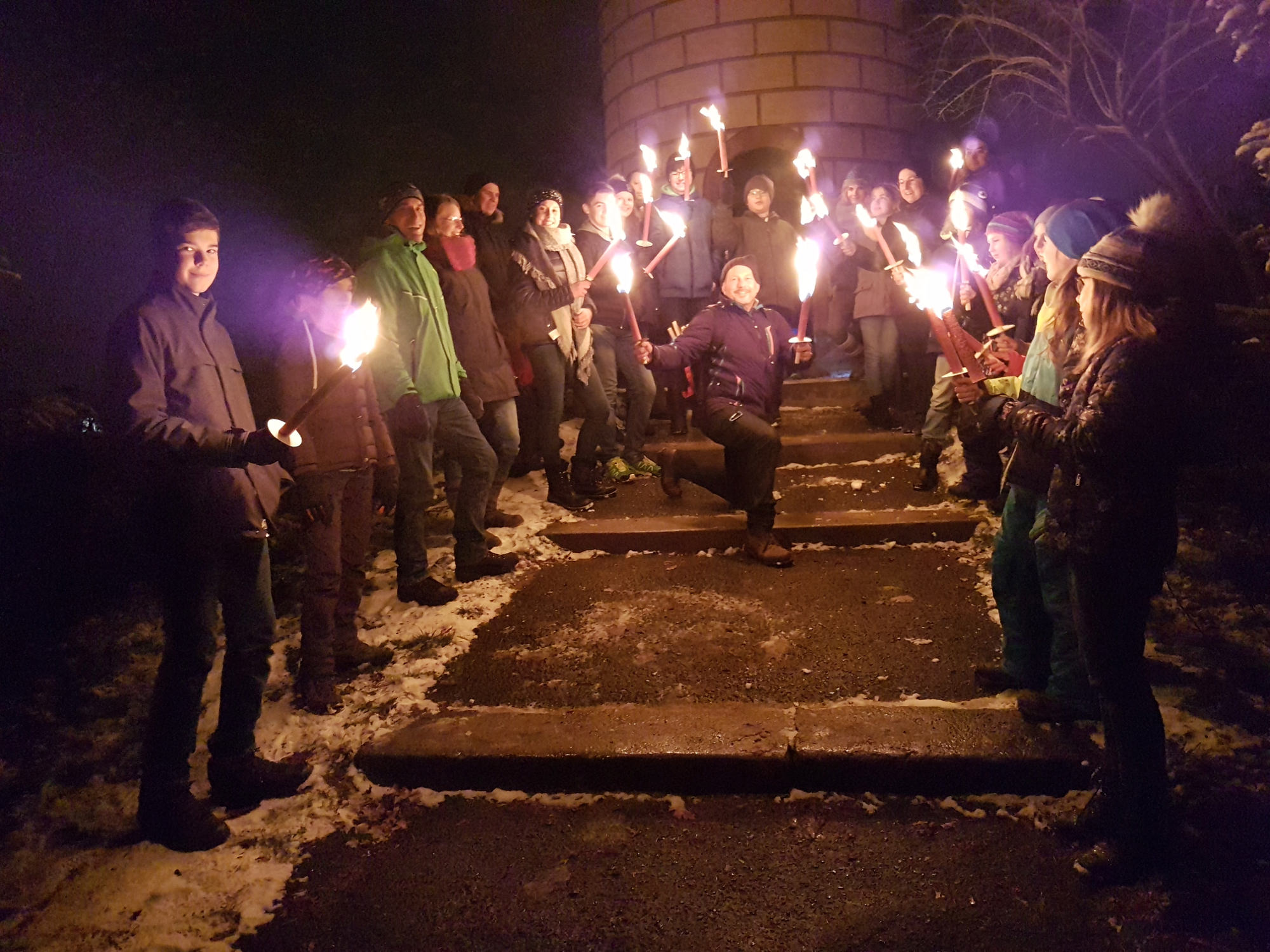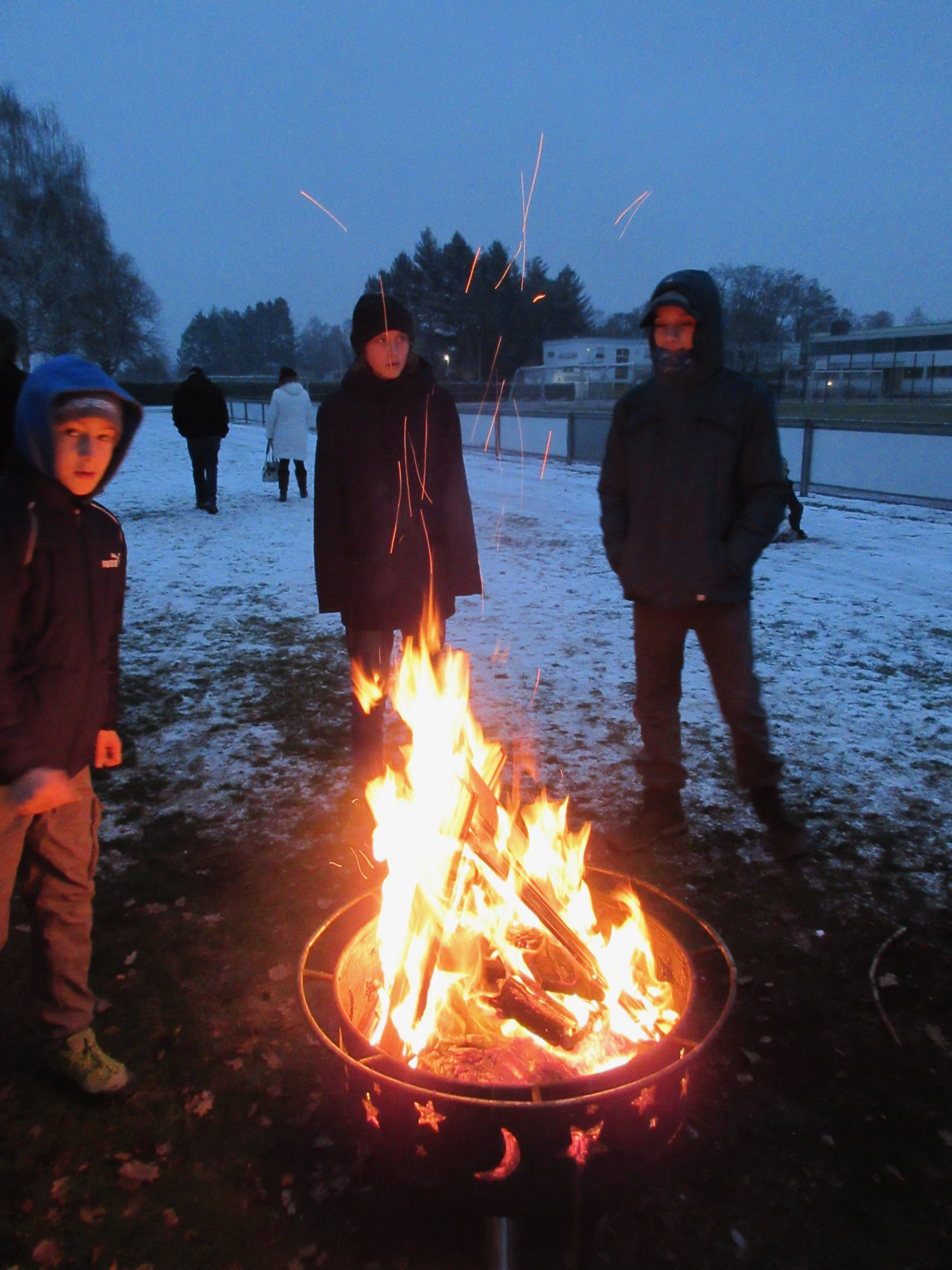 Dann wurden vom Abteilungsleiter Detlef Staffa alle Trainer vorgestellt und für ihre aufopferungsvolle Arbeit mit einem kleinen Präsent geehrt ehe es in Richtung Schönbusch losging. Von dort aus machte sich der Fackelwurm auf den Weg zum Schönbuschturm. Knisternde Fackeln im weiß verschneiten Gelände ließen Weihnachtstimmung aufkommen. In der Zwischenzeit bereitete Dirk mit seinem Team das Abendessen, Erbsensuppe mit Würstchen, vor, welches nach der einstündigen Fackelwanderung mit Heißhunger gegessen wurde.