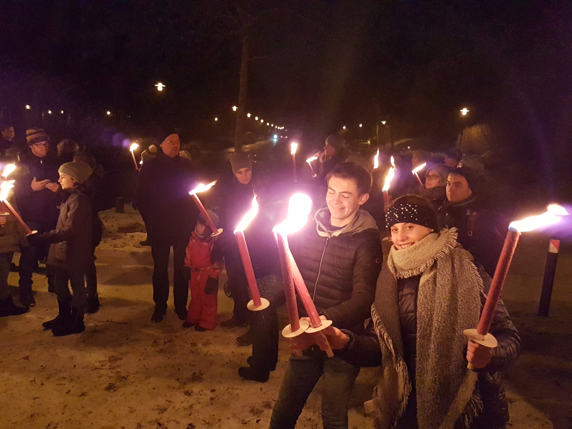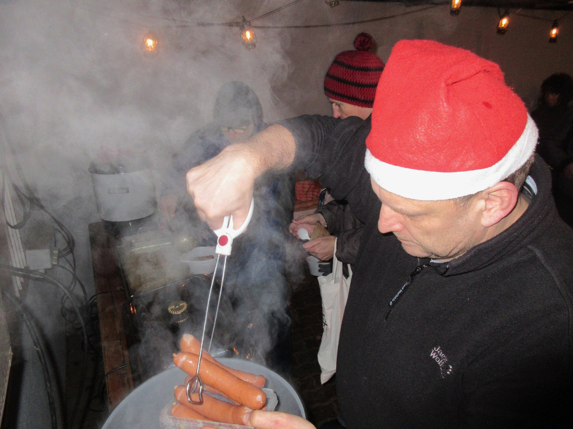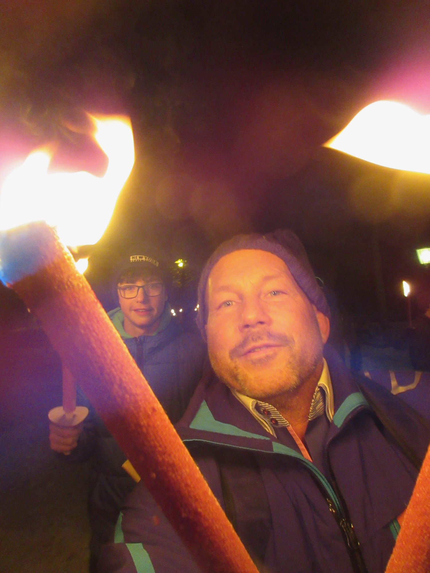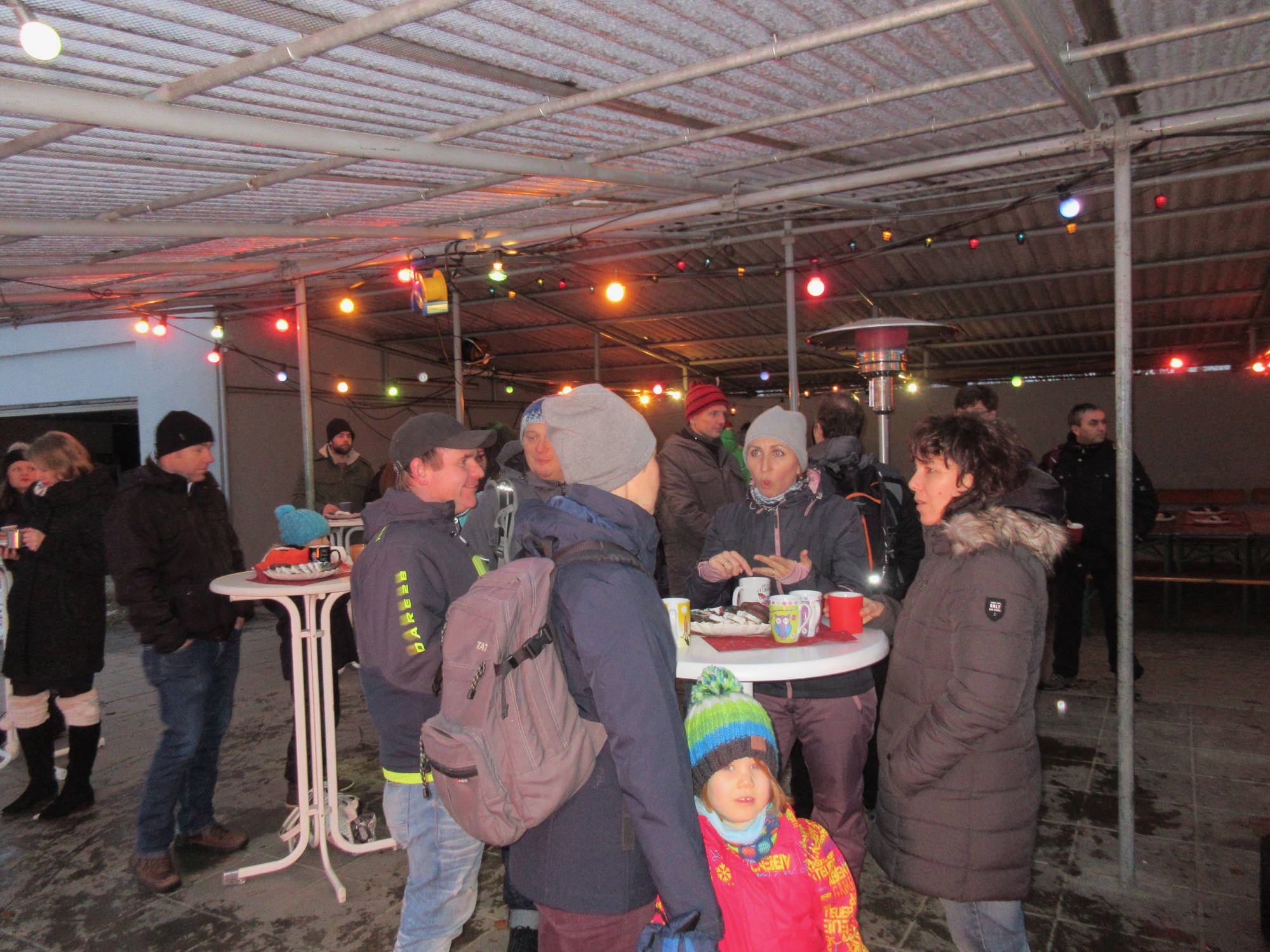 Dann wurden vom Abteilungsleiter Detlef Staffa alle Trainer vorgestellt und für ihre aufopferungsvolle Arbeit mit einem kleinen Präsent geehrt ehe es in Richtung Schönbusch losging. Von dort aus machte sich der Fackelwurm auf den Weg zum Schönbuschturm. Knisternde Fackeln im weiß verschneiten Gelände ließen Weihnachtstimmung aufkommen. In der Zwischenzeit bereitete Dirk mit seinem Team das Abendessen, Erbsensuppe mit Würstchen, vor, welches nach der einstündigen Fackelwanderung mit Heißhunger gegessen wurde.